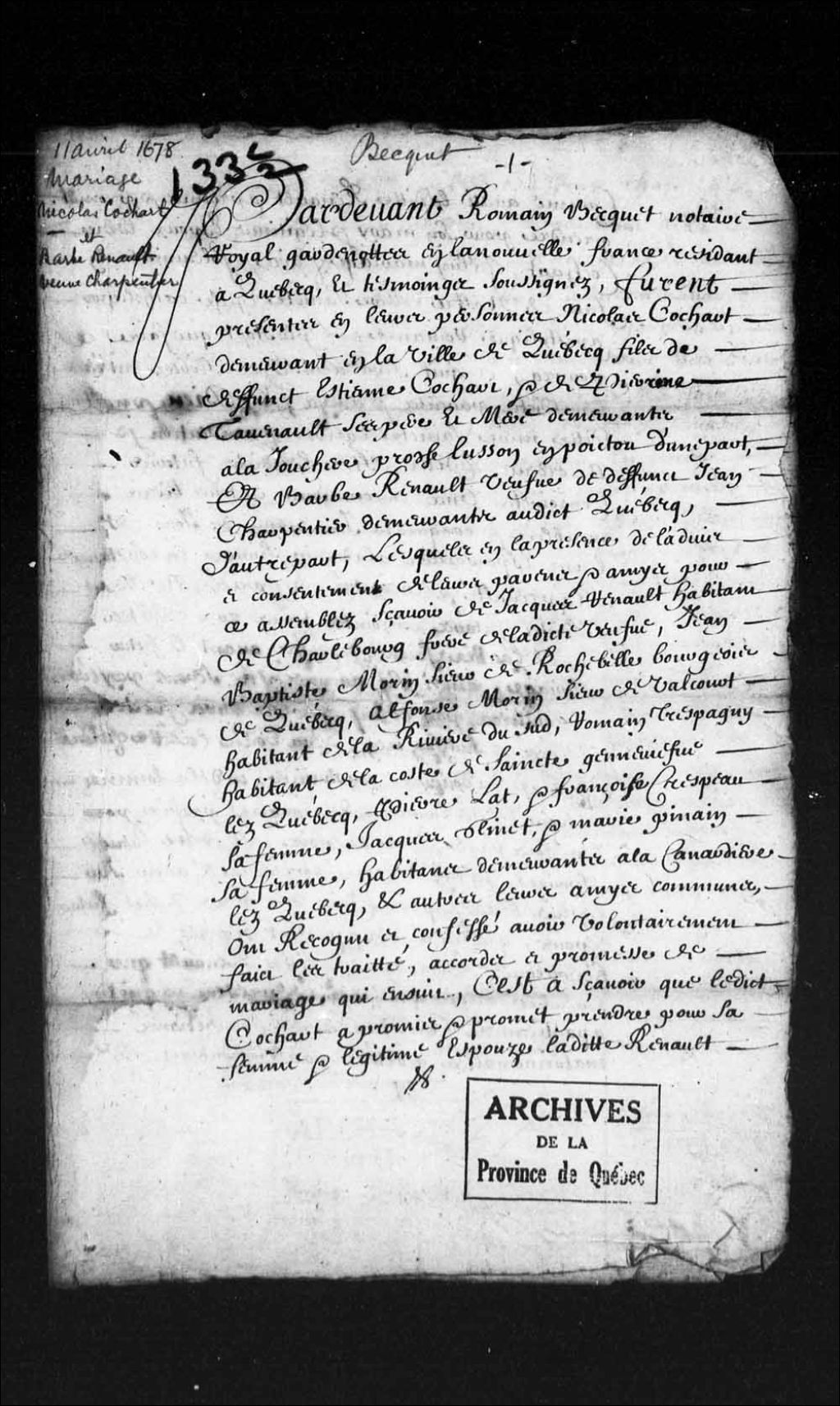 Contrat de mariage de Nicolas Cochart, demeurant à Québec, dont les parents sont de la Touchère, proche Lusson, en Poitou, et Barbe Renaud, veuve de Jean Charpentier, demeurant à Québec, 11 avril 1678, Archives nationales à Québec, Collection Pièces judiciaires et notariales, (03Q,TL5,D133.2).