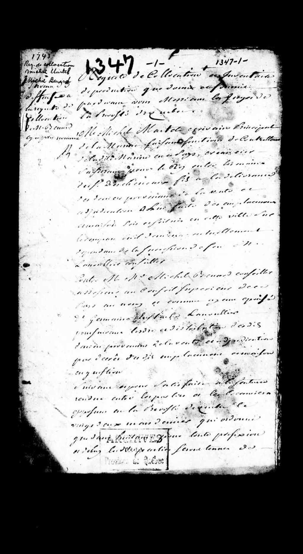 Requête de collocation et inventaire de production présentée à la Prévôté de Québec dans l'affaire opposant Michel Martel, écrivain principal de la Marine, faisant les fonctions de contrôleur de la Marine dans ce pays, créancier saisissant pour le Roi, et Michel Benard (Bénard), conseiller assesseur du Conseil supérieur de Québec, au nom et comme ayant épousé Germaine-Eustache Lanoullier, concernant la distribution des deniers provenant de la vente et adjudication par arrêt, d'une maison appartenant à la succession Lanoullier (Lanouillier - Lanouiller)