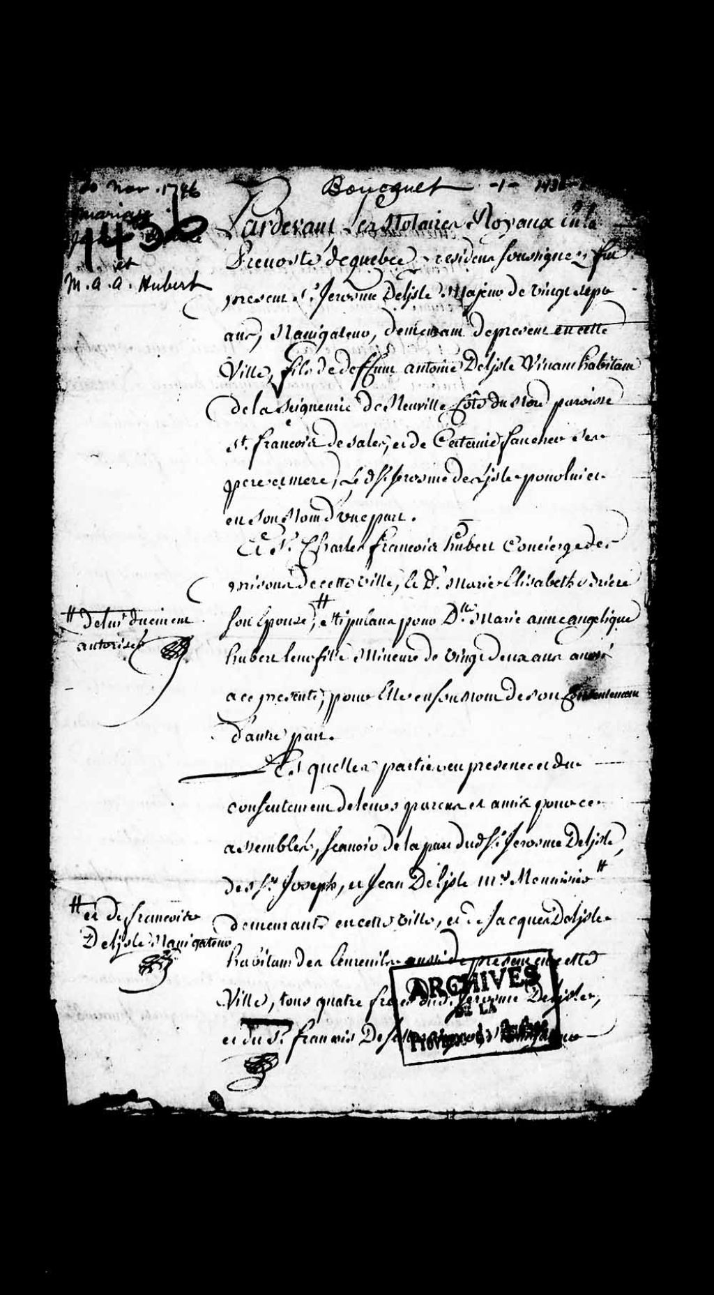 - Contrat de mariage de Jérôme Delisle, navigateur, fils de Antoine Delisle, de Neuville, et de Marie-Anne-Angélique Hubert, fille de Charles-François Hubert, concierge des prisons de Québec