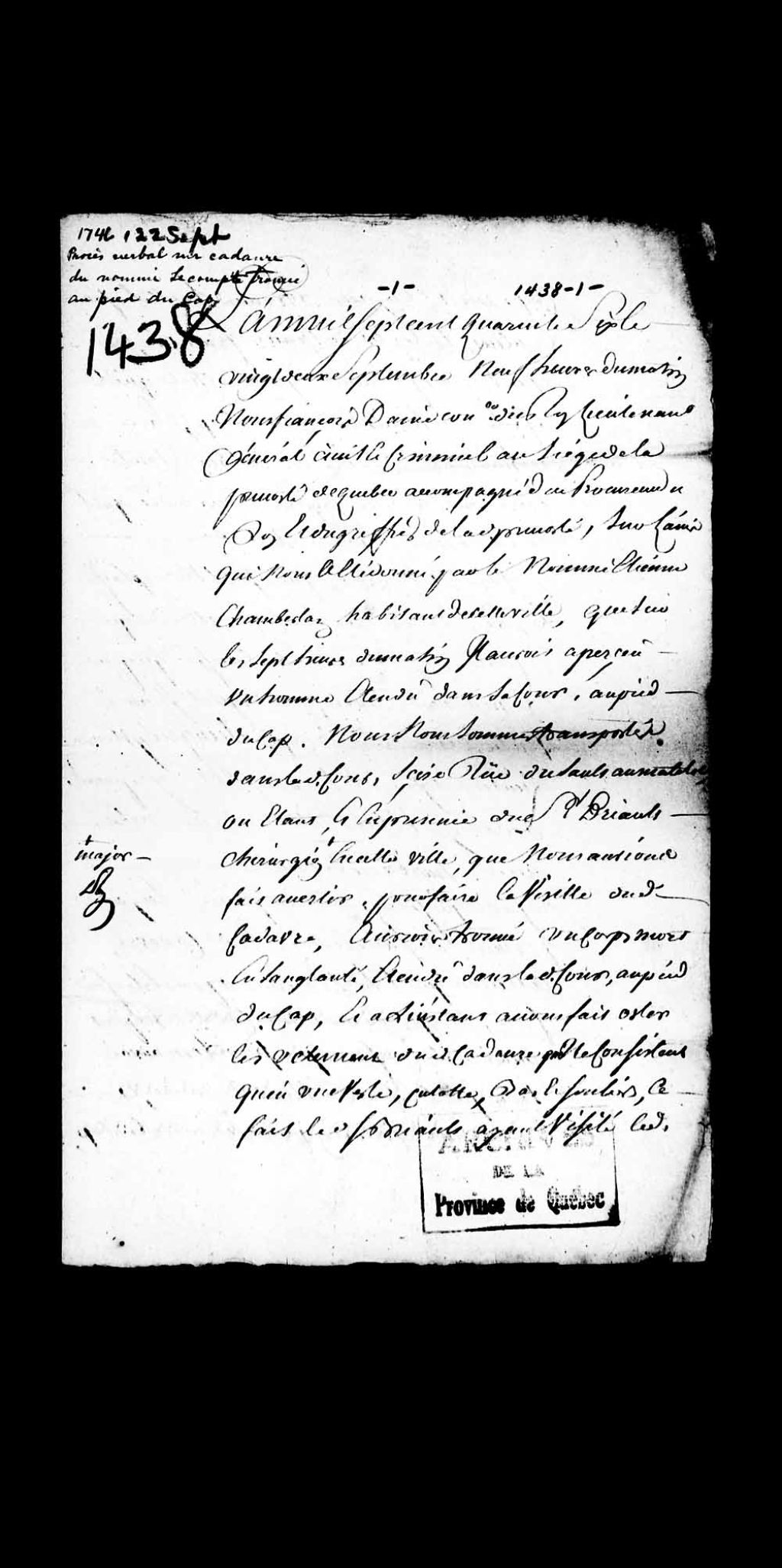 Procès-verbal sur le cadavre du nommé Lecomte, trouvé mort au pied du cap du Sault-au-Matelot à Québec, fait par le sieur Antoine Briault, chirurgien de Québec; ledit défunt étant probablement tombé dans ledit cap, 22 septembre 1746, Archives nationales à Québec, Collection Pièces judiciaires et notariales, (03Q,TL5,D1438).