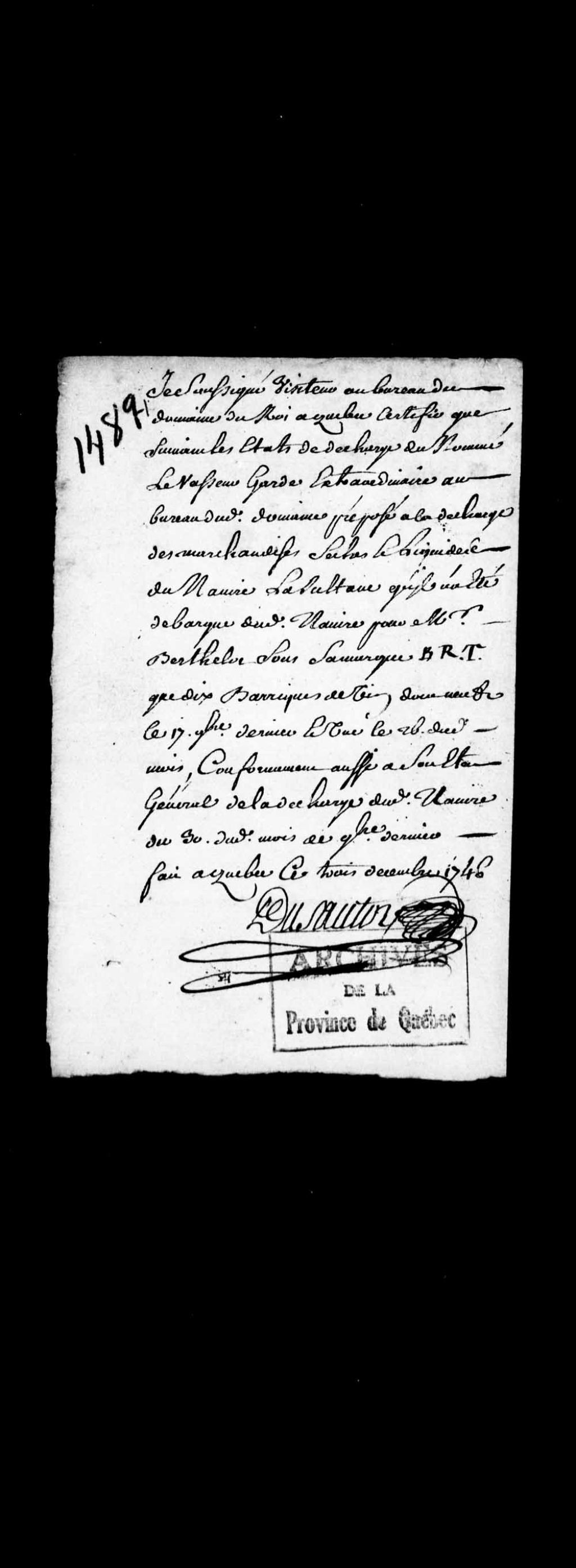 - Procès de Étienne Dacier (Dassié), capitaine du navire «la Sultane», demandeur, contre Charles Berthelot, négociant, de Québec, défendeur, à propos de la livraison d'une barrique de vin rouge