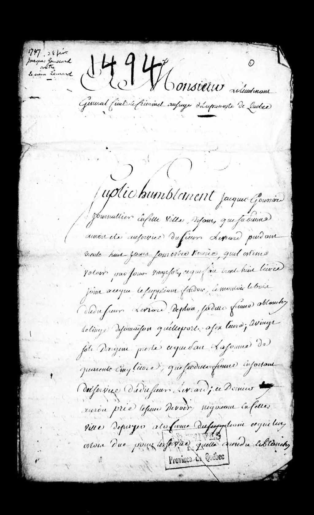 Procès de Jacques Goussard, journalier de Québec, contre le sieur Levrard