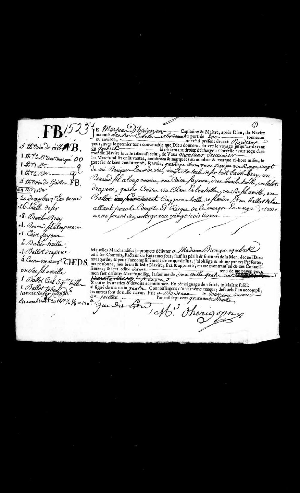 - Diverses polices d'assurance française sur des marchandises envoyées au Canada, dont plusieurs concernent Étienne Desaulniers sieur de Beaubien