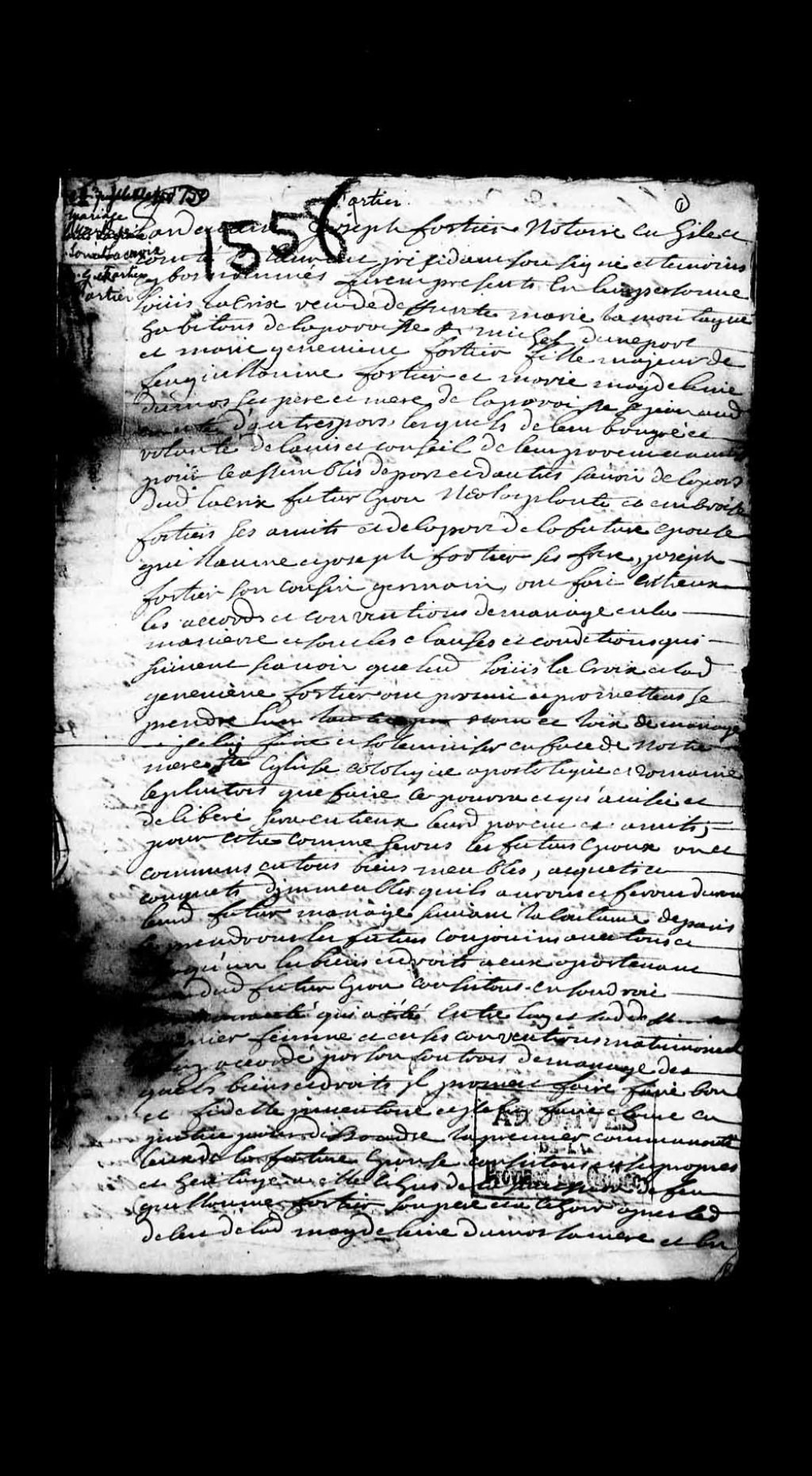 - Contrat de mariage de Louis Lacroix, veuf de Marie Lamontagne, habitant de Saint-Michel, et de Marie-Geneviève Fortier, fille de feu Guillaume Fortier et Marie-Madeleine Dumas, du même lieu