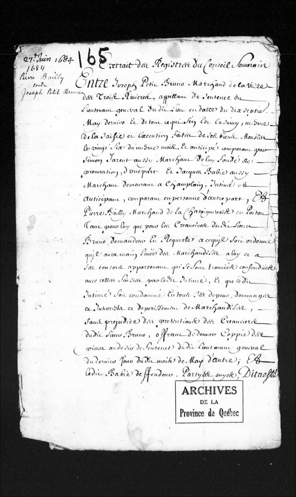Procès en appel à propos d'une saisie faite sur Pierre Bailly, marchand, en Poitou, créancier de Joseph Petit Bruneau, marchand, des Trois-Rivières, suite à la sentence du lieutenant général des Trois-Rivières, rendue le 17 mai 1684, entre ledit Bruneau et Jacques Babie (Baby), marchand demeurant à Champlain, 27 juin 1684, Archives nationales à Québec, Collection Pièces judiciaires et notariales, (03Q,TL5,D165).