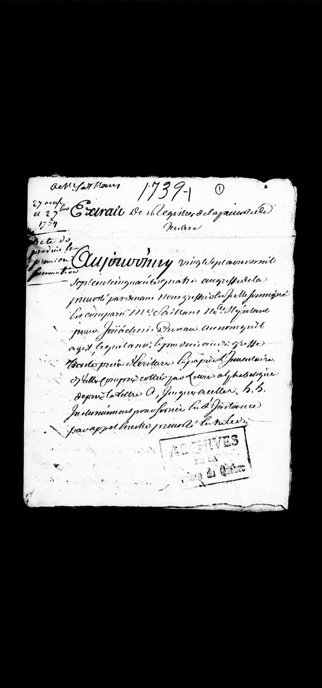 - Ce dossier en matières civiles provient de la Juridiction seigneuriale de Beaupré et de la Prévôté de Québec. Il comprend six extraits des registres de la Prévôté de Québec : le premier qui enregistre les pièces déposées par ledit Bureau, le second qui maintient le verdict de la sentence en appel et condamne l'appelant à l'amende, le troisième qui accorde un délai à l'appelant, le quatrième qui accorde un délai à l'intimé afin de fournir ses réponses aux griefs, le cinquième donne un défaut contre Pierre Garneau non comparant, et le sixième appointe les parties à fournir leurs pièces dans les délais de l'ordonnance; deux exploits d'assignation à Garneau; l'acte de donation d'une terre située à Beaupré en la paroisse de l'Ange-Gardien par Garneau et Marie Masoueste (Masouet) son épouse à leurs enfants; l'inventaire des biens de la communauté entre Catherine Soulard, veuve de Pierre Vachon; l'inventaire des biens de la communauté entre Louis Garneau, veuf de feue Marie-Anne Huot; une copie collationnée du contrat de mariage entre Louis Garneau et Catherine Soulard; le procès-verbal d'inventaire des biens appartenant au défunt Garneau; un contrat de vente de Jacques Huot et Angélique Trudelle, son épouse, à François et Louis Garneau; quatre suppliques adressée au juge prévôt de la Juridiction de Beaupré par Joachim Bureau afin de faire assigner Pierre Garneau; trois extraits des registres de la Juridiction de Beaupré, le premier condamne le défendeur comme tenant les biens de Louis Garneau à rendre compte au demandeur de sa gestion et administration, le second ordonne que le défendeur sera tenu d'affirmer le compte par lui rendu, et le troisième ordonne de procéder à l'inventaire des biens de la succession de Louis Garneau et de Catherine Soulard; une requête de signification audit Bureau; deux suppliques adressées au lieutenant général civil et criminel de la Prévôté de Québec, la première par Bureau afin de faire appel sur la sentence du 23 mars 1752, et la seconde par Pierre Garneau afin de faire assigner Bureau; un compte que rend Pierre Garneau; le contrat de mariage entre Pierre Garneau et Thérèse Huot (notaire Jacob); deux exploits d'assignation à Garneau; le débat de compte fournit par Joachim Bureau; l'inventaire des productions de Bureau; une requête par Bureau pour acte de sa production; le soutènement fournit par Garneau; déposition du procureur qui donne acte des productions de Garneau; ainsi que l'inventaire des pièces fournies par Bureau
