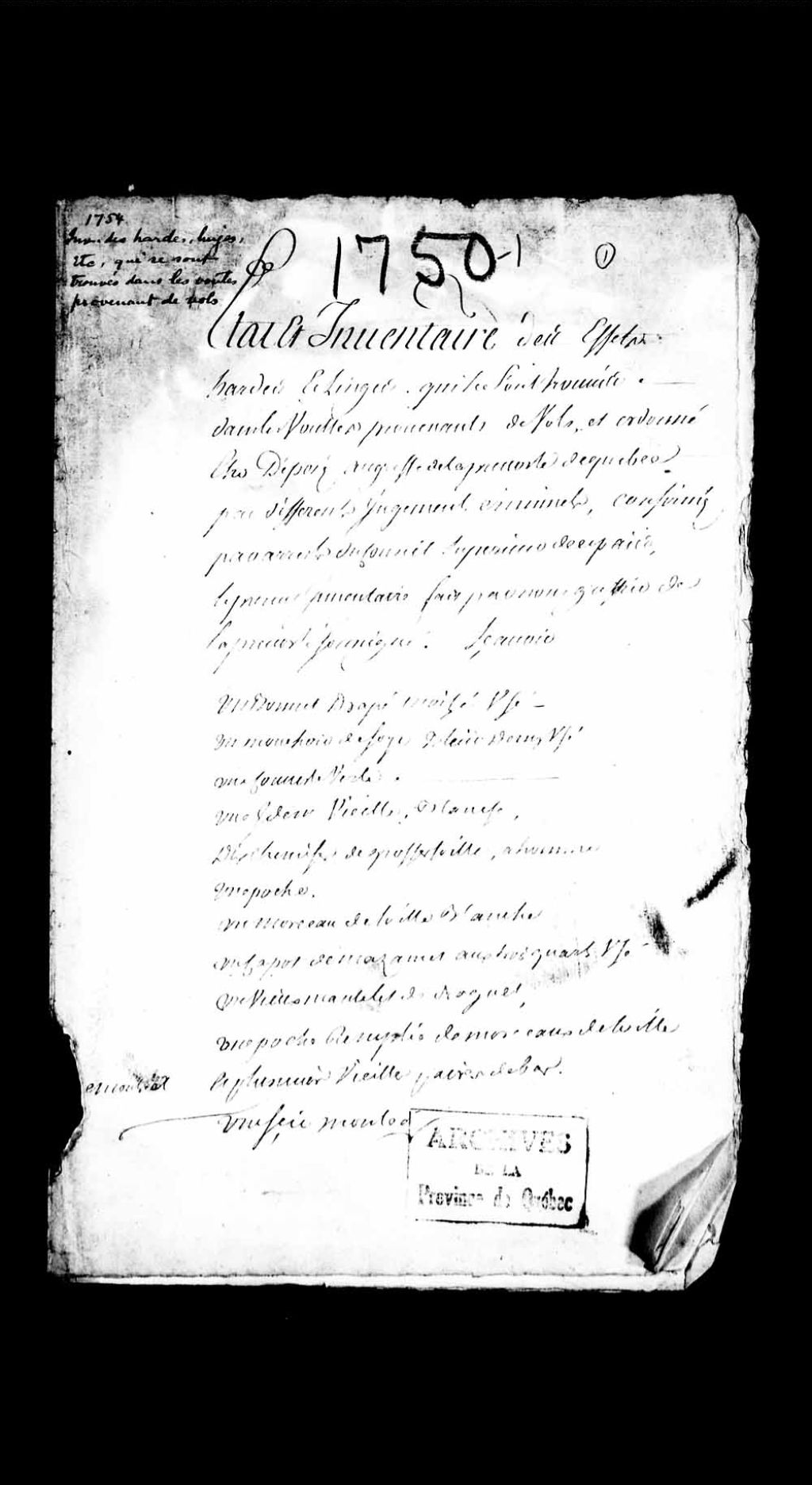 Inventaire des hardes, linges, etc., qui se sont trouvés dans les voûtes de la Prévôté provenant de vols, 12 janvier 1754, Archives nationales à Québec, Collection Pièces judiciaires et notariales, (03Q,TL5,D1750).