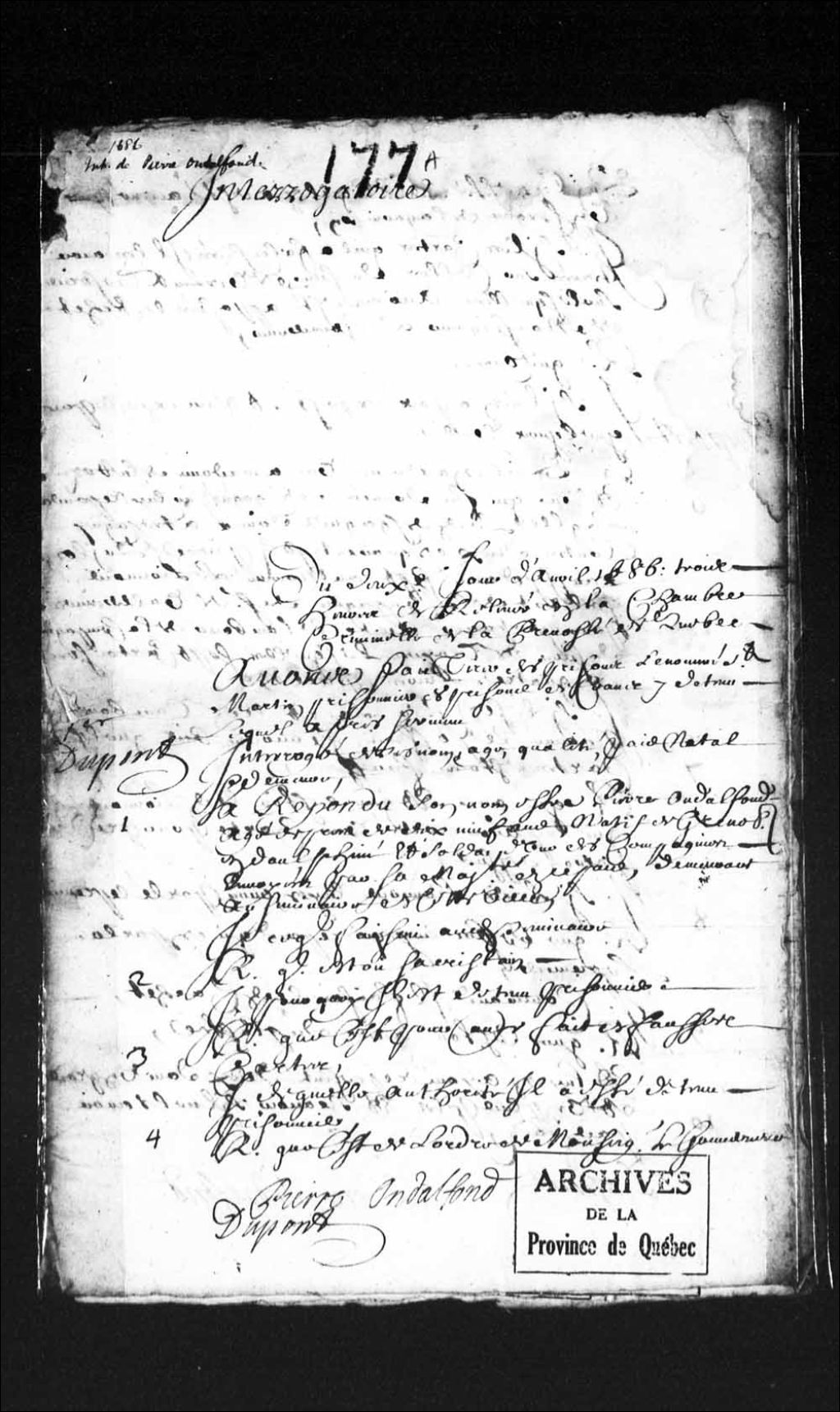 Interrogatoire de Pierre Ondalfond dit Saint-Martin, 19 ans, natif de Grenoble, en Dauphiné, soldat d'une des compagnies envoyées par Sa Majesté en ce pays (Des Méloizes), demeurant au Séminaire de Québec et y servant comme sacristain, accusé d'avoir fabriqué des fausses cartes, 2 avril 1686, Archives nationales à Québec, Collection Pièces judiciaires et notariales, (03Q,TL5,D177).