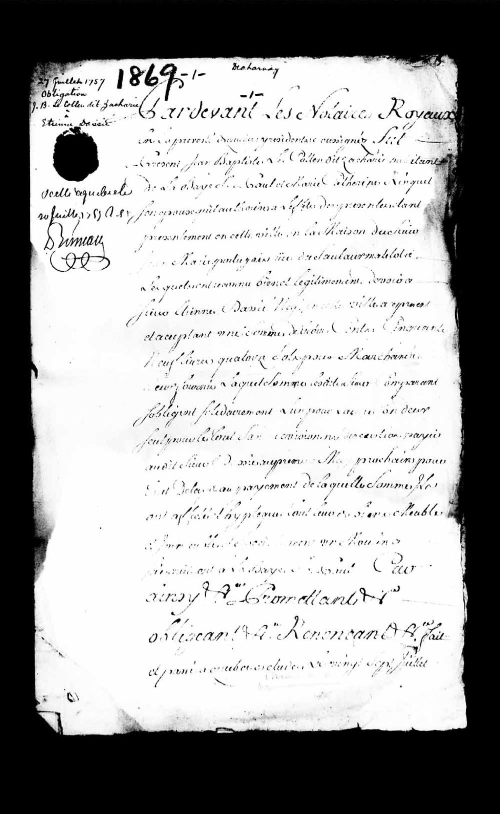 Obligation par Jean-Baptiste Le Collen dit Zacharie, habitant de la Baie Saint-Paul, et Marie-Catherine Ringuet, son épouse, à Etienne Dassié (Dacier), négociant, de Québec, 27 juillet 1757, Archives nationales à Québec, Collection Pièces judiciaires et notariales, (03Q,TL5,D1869).