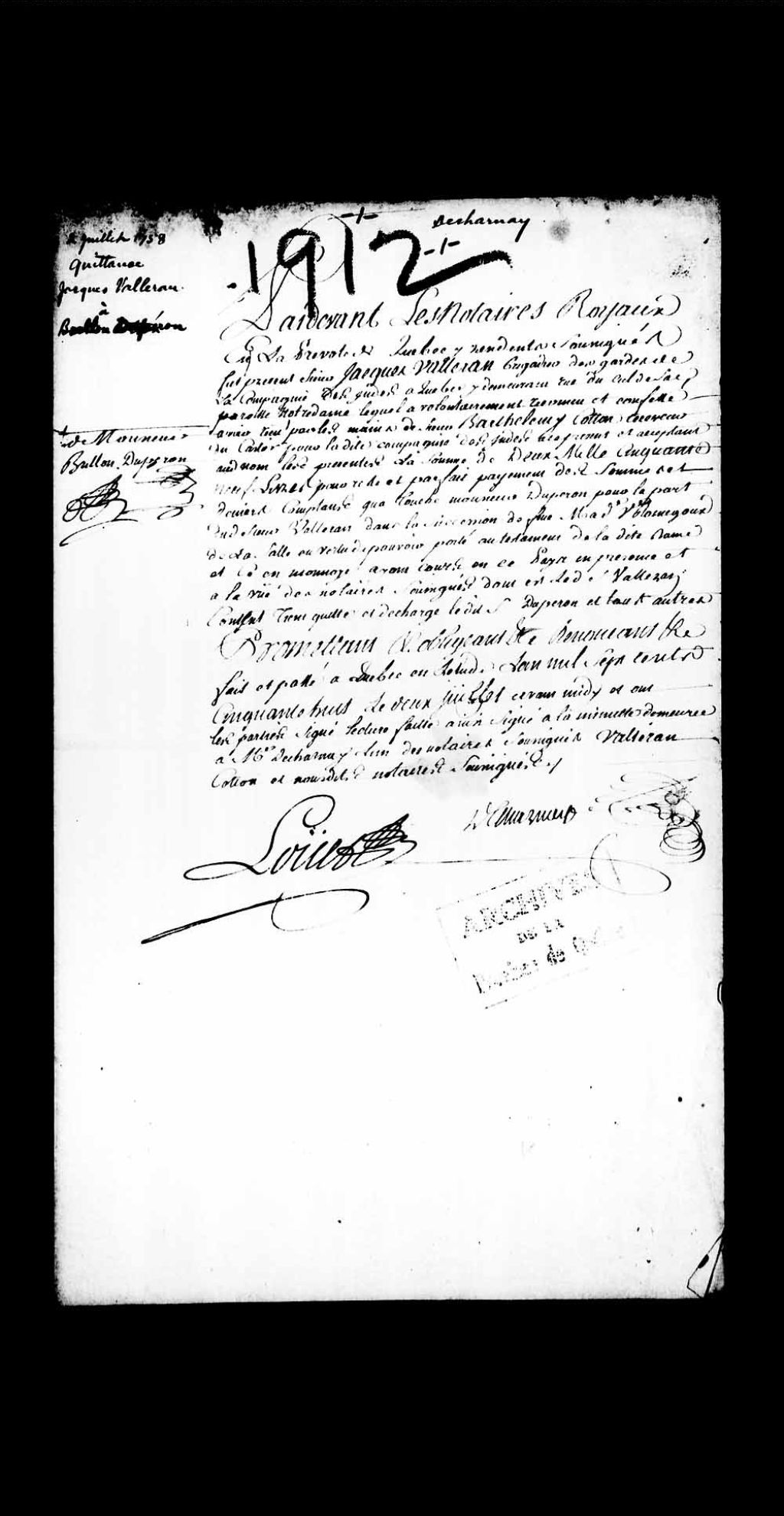 Quittance par Jacques Valleran (Vallerand), brigadier des gardes de la compagnie des Indes à Québec, y demeurant rue du Cul-de-Sac, à Brillon Duperon pour la somme de 2059 livres que touche monsieur Duperon pour la part de Valleran dans la succession de feue Romegoux de La Salle, 2 juillet 1758, Archives nationales à Québec, Collection Pièces judiciaires et notariales, (03Q,TL5,D1912).