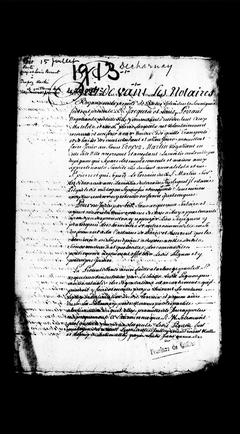 - Vente par Jacques et Louis Perrault, négociants à Québec, à Tropez Martin, négociant à Québec, de la moitié ou mitoyen du pignon qui sépare les emplacements et maisons sur la rue Sault-au-Matelot