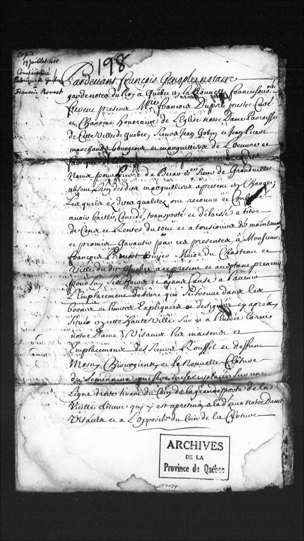 Concession de la Fabrique de Québec à François Provost, d'un emplacement situé en la Haute-Ville de Québec, «sur et à l'entrée la rue Notre-Dame, vis-à-vis les maisons et emplacements des sieurs Roussel et défunt de Mosny, chirurgien, et la nouvelle clôture du Séminaire», 19 juillet 1688, Archives nationales à Québec, Collection Pièces judiciaires et notariales, (03Q,TL5,D198).