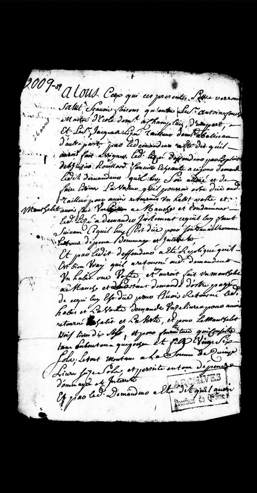 - Sentence du juge prévôt de la seigneurie de Batiscan, Jacques Rouillard dit Fonville, dans la cause opposant Antoine Faucher, maître d'école demeurant à Champlain, à Jacques Lisé (Lizé), tailleur demeurant à Batiscan, concernant le prix d'un habit, d'une veste et d'un mantelet que ledit tailleur a retournés gratuitement audit Faucher qui souhaite en faire estimer le prix pour payer la somme due audit tailleur