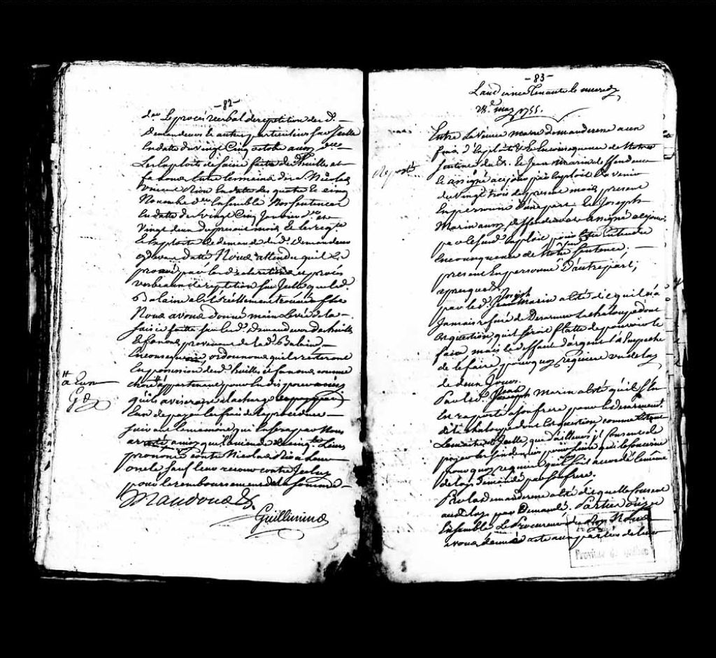 - Jugement rendu par Guillimin, lieutenant civil et criminel de l'Amirauté de Québec, en faveur de la veuve Lamarre, demanderesse, dans la cause l'opposant aux frères Jean Marin et Joseph Marin, défendeurs, concernant une chaloupe qui devait être désarmée par lesdits frères Marin
