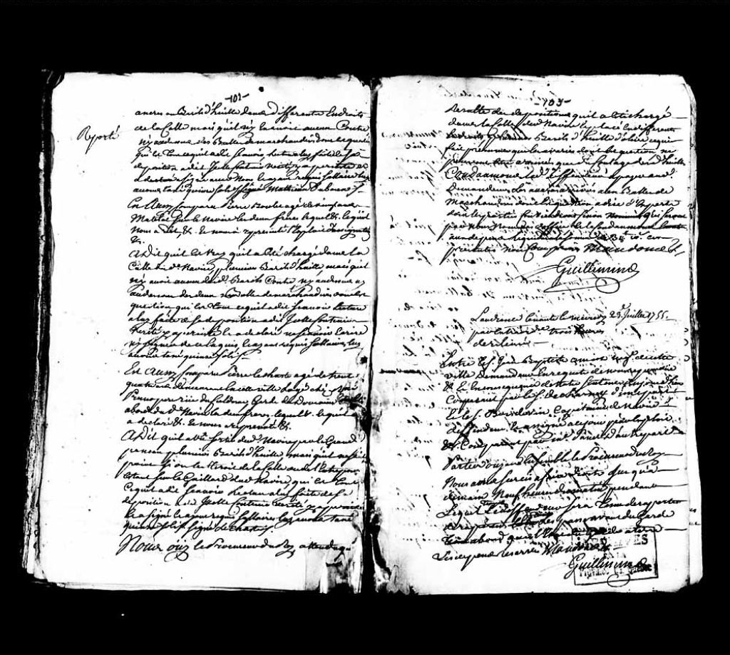 Report de la sentence de Guillimin, lieutenant civil et criminel de l'Amirauté de Québec, dans la cause opposant Jean-Baptiste Amiot (Amyot), négociant à Québec, demandeur, au sieur Boisdevin (Bois de Vin), capitaine de navire, défendeur…, 23 juillet 1755, Archives nationales à Québec, Collection Pièces judiciaires et notariales, (03Q,TL5,D2010-58).