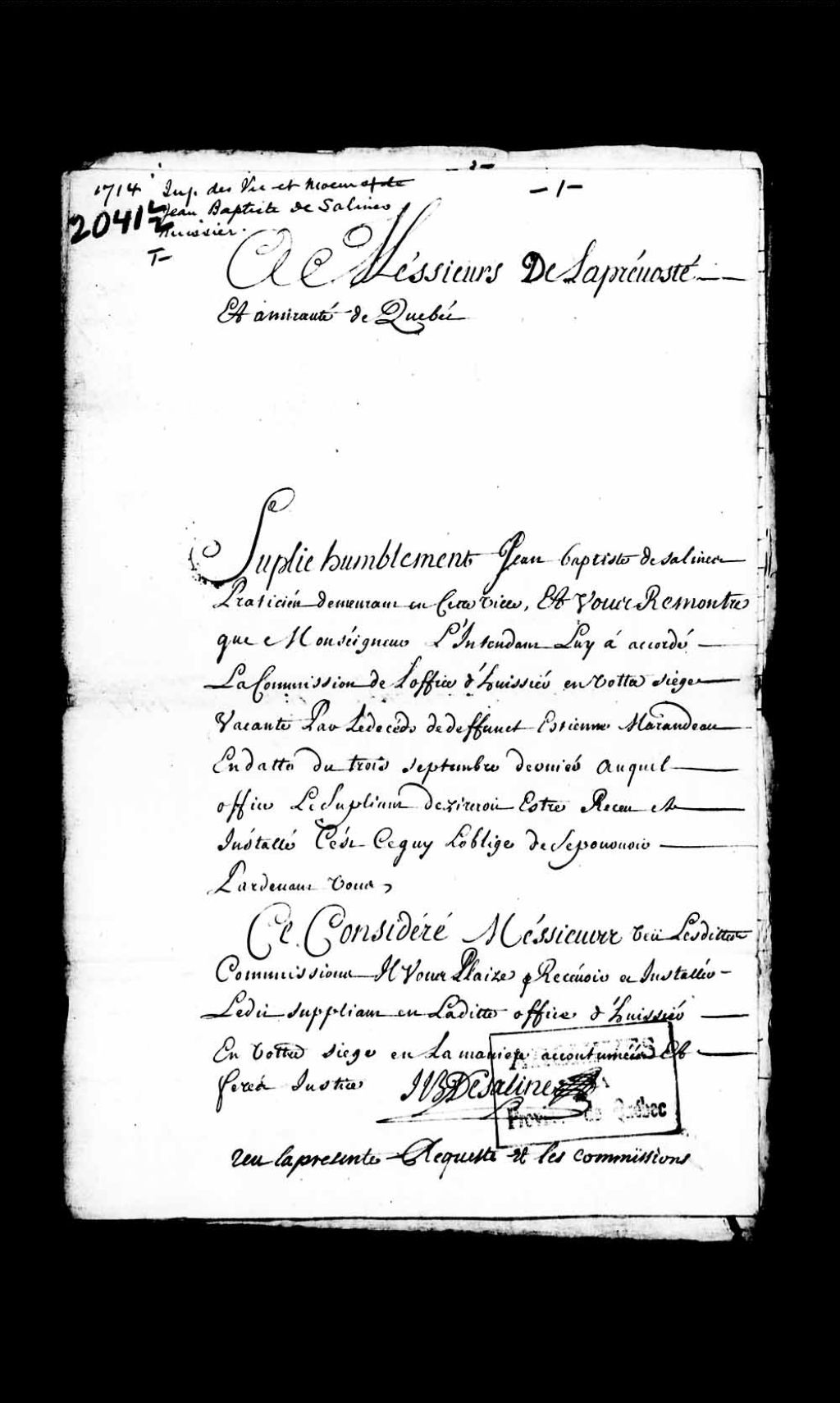 Information de vie et moeurs de Jean-Baptiste de Salines (Dessalines), praticien, de Québec, pourvu d'une commission d'office d'huissier en la Prévôté de Québec vacant par le décès du sieur Étienne Marandeau
