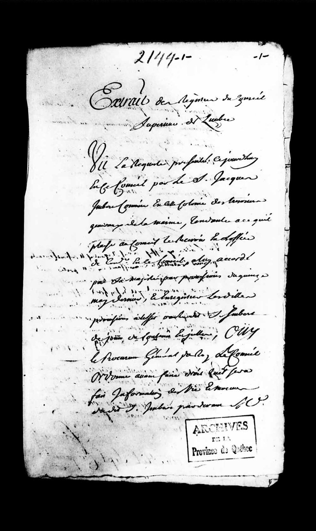 Information de vie et moeurs de Jacques Imbert, commis en cette colonie des trésoriers généraux de la marine, nommé par provisions de Sa Majesté du 15 mai 1754, conseiller au Conseil supérieur de Québec