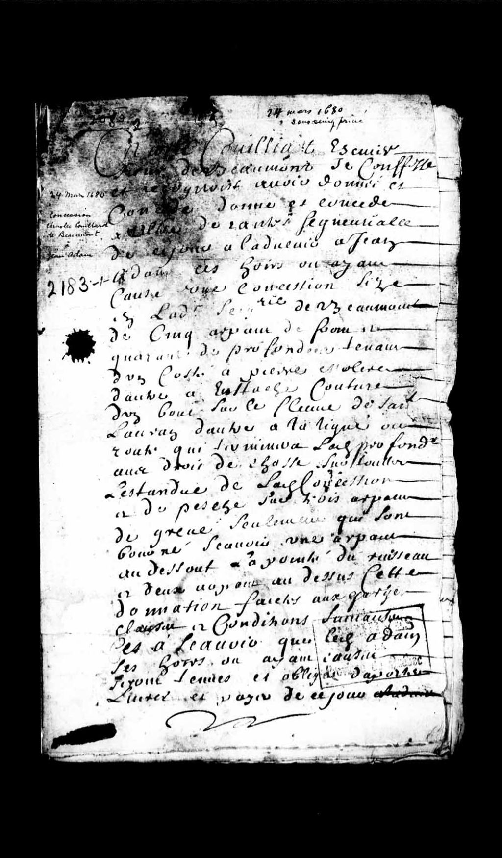 - Concession sous seing privé par Charles Couillard de Beaumont à Jean Adam