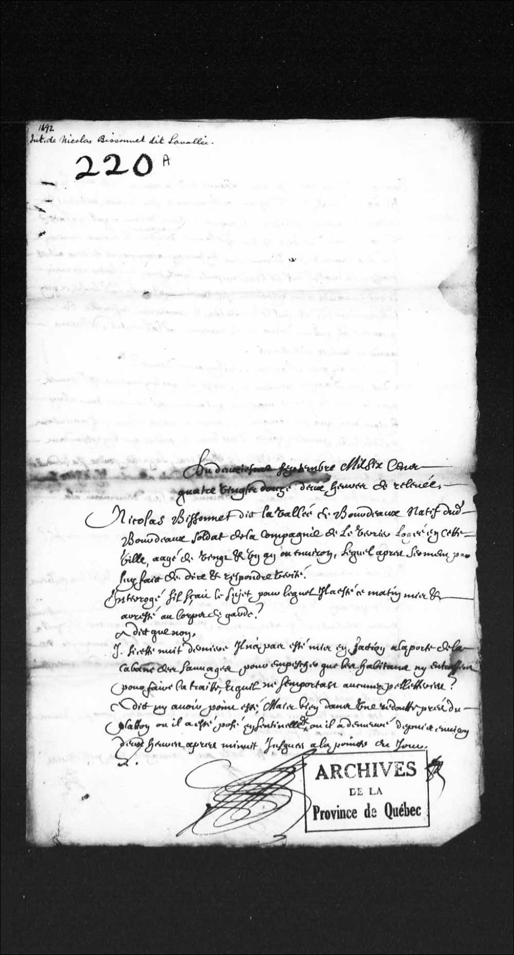 Procédures criminelles contre Nicolas Bissonnet dit Lavallée (La Vallée), Marteau dit Léveillé et Auger dit Lafleur, accusés d'avoir volé des sauvages (Amérindiens), 2 septembre 1692 - 3 septembre 1692, Archives nationales à Québec, Collection Pièces judiciaires et notariales, (03Q,TL5,D220).