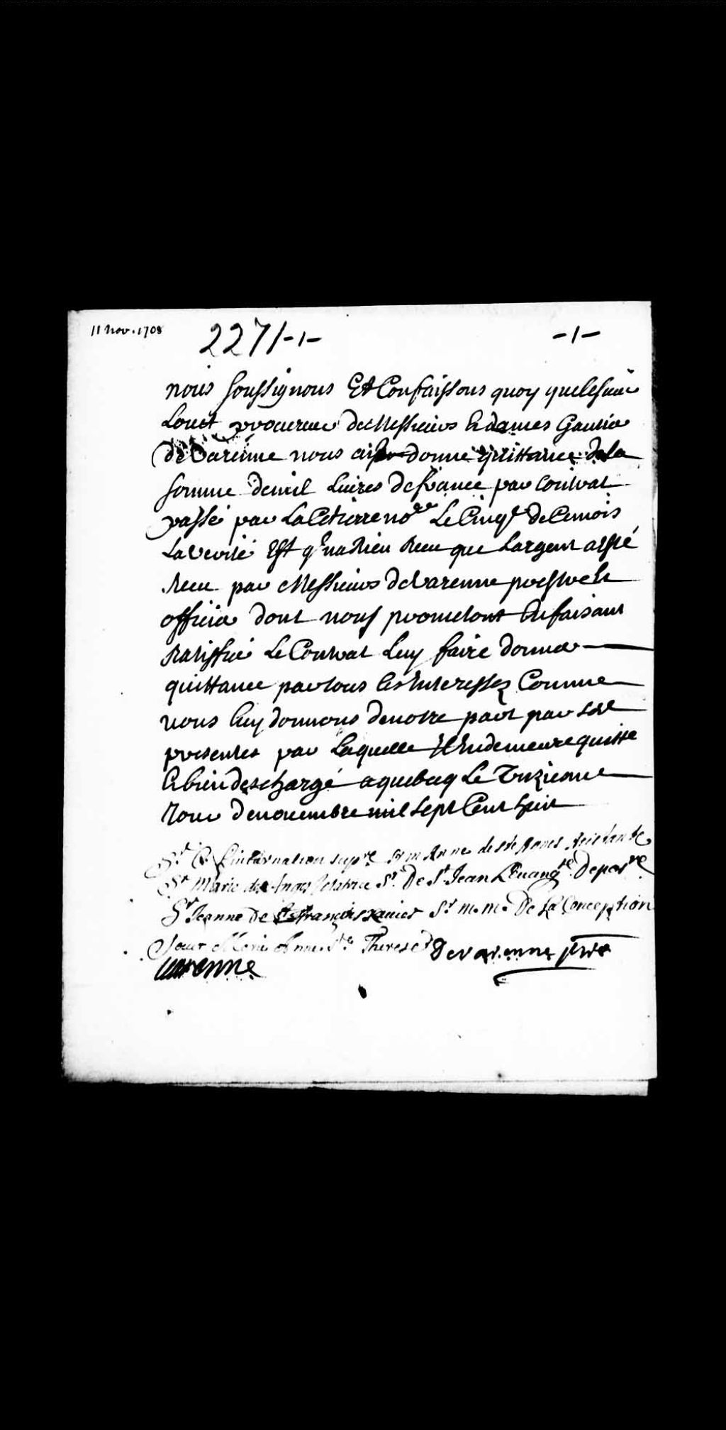 Procuration par les héritiers de feu Charles Gaultier de la Vérendrye à Jean-Claude Louet, de Québec, 2 novembre 1707, Archives nationales à Québec, Collection Pièces judiciaires et notariales, (03Q,TL5,D2271).