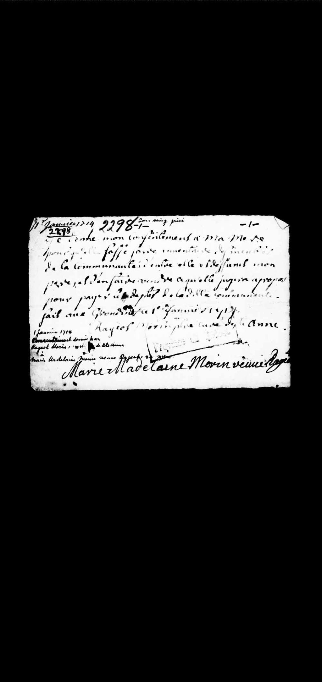 Consentement sous seing privé donné par Rageot Morin, prêtre, curé de Sainte-Anne, à Marie-Madeleine Morin, veuve Rageot, sa mère, à ce qu'elle fasse faire un inventaire des biens de sa communauté, 1er janvier 1714, Archives nationales à Québec, Collection Pièces judiciaires et notariales, (03Q,TL5,D2298).