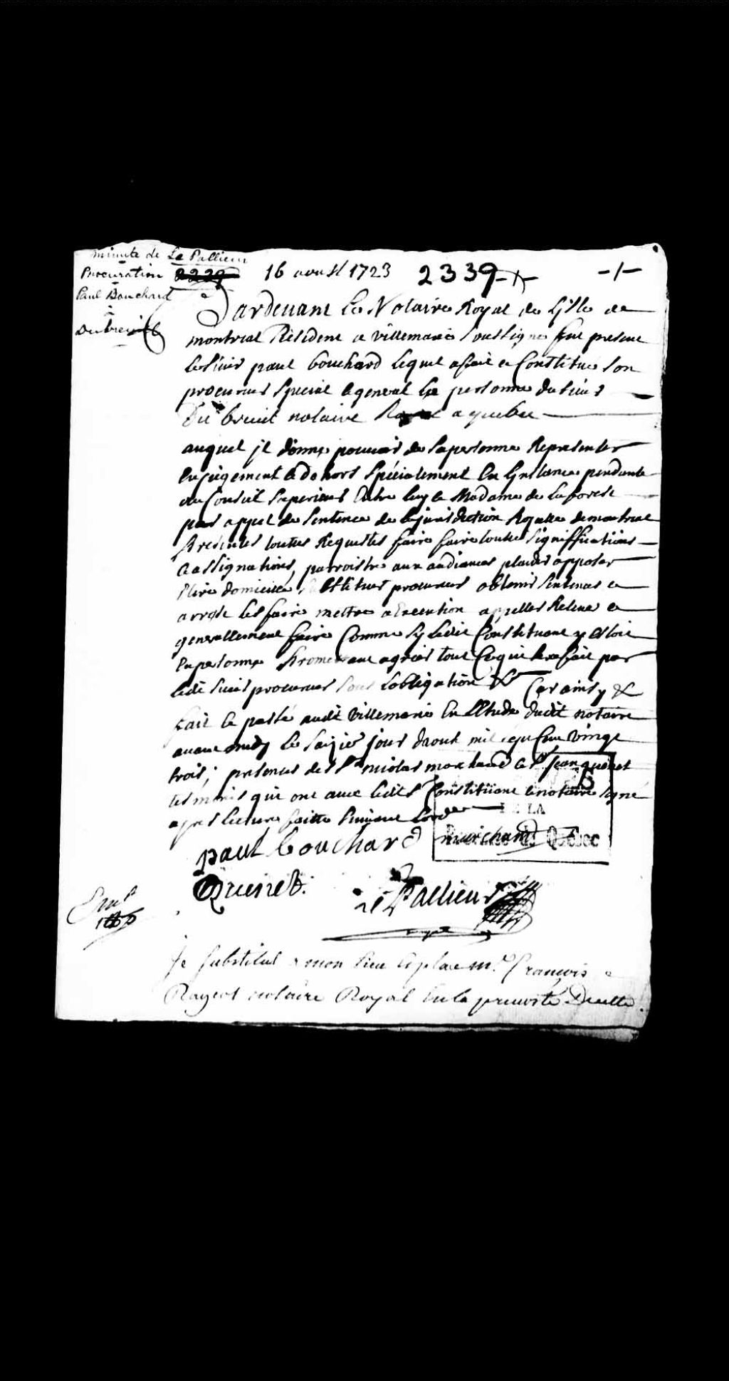 Procuration faite par Paul Bouchard au sieur Dubreuil, notaire royal à Québec, pour le représenter dans l'instance qui l'oppose à Madame de Laforce devant le Conseil Supérieur; suivie d'un acte de substitution dudit Dubreuil par François Rageot, notaire royal en la Prévôté de Québec, 16 août 1723 - 13 mars 1724, Archives nationales à Québec, Collection Pièces judiciaires et notariales, (03Q,TL5,D2339).