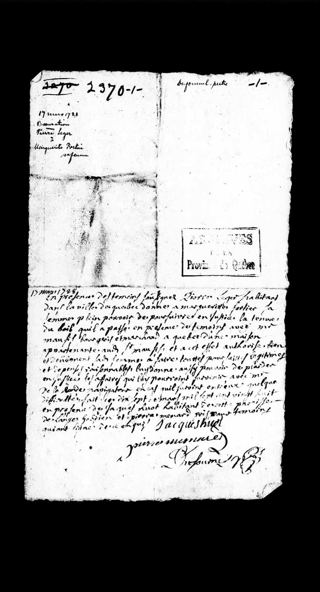 Procuration faite par Pierre Léger, habitant de la ville de Québec, à Marguerite Forestier, sa femme, pour le représenter en justice dans l'instance qui l'oppose au sieur Maufils, bourgeois et marchand de Québec, 17 mars 1728, Archives nationales à Québec, Collection Pièces judiciaires et notariales, (03Q,TL5,D2370).