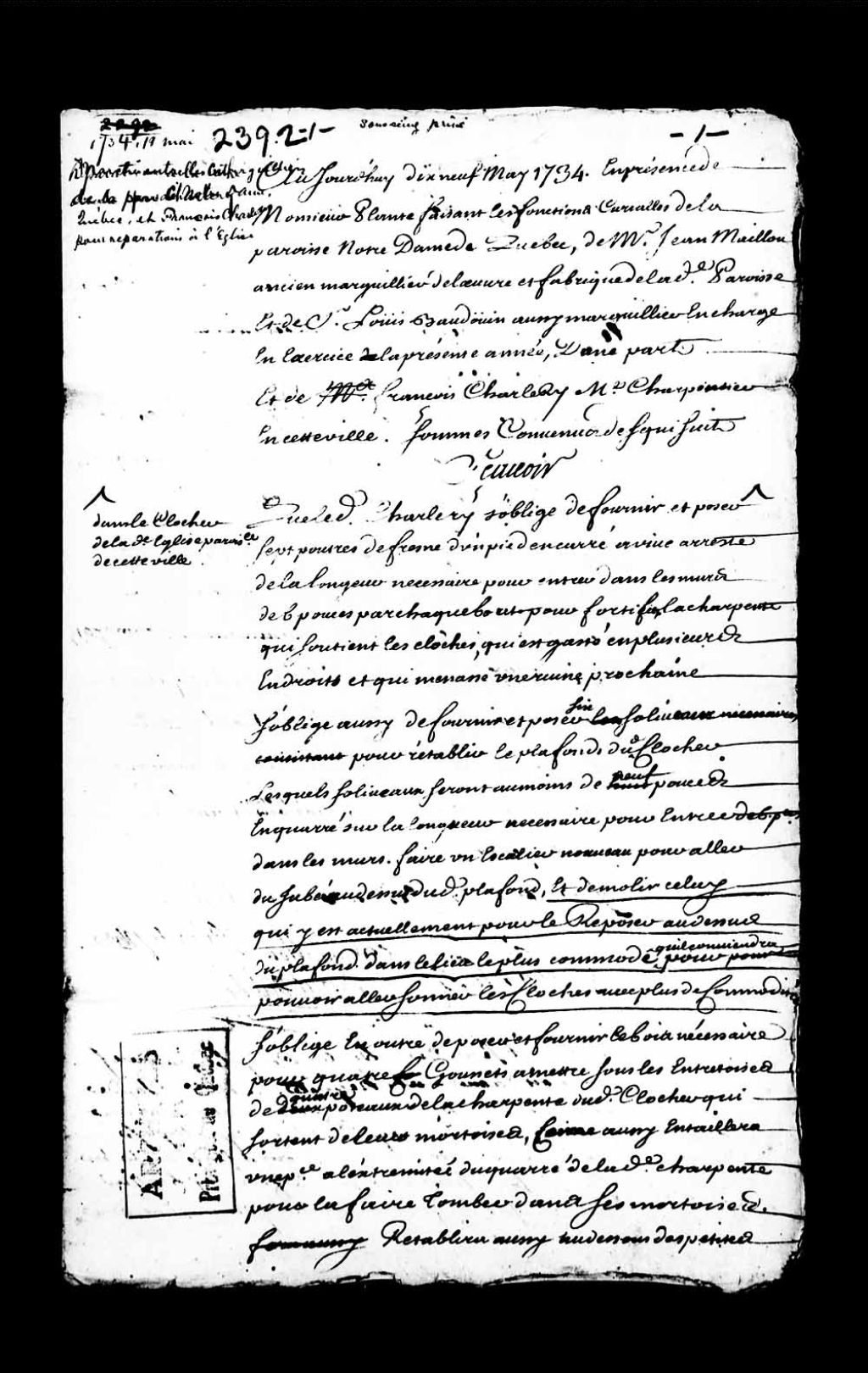 Marché sous seing privé entre Monsieur Plante, curé de la paroisse Notre-Dame de Québec; les marguilliers de Notre-Dame de Québec, Jean Mailloux et Louis Beaudoin; et François Charlery, maître-charpentier, pour réparations à la cathédrale de Québec, 19 mai 1734, Archives nationales à Québec, Collection Pièces judiciaires et notariales, (03Q,TL5,D2392).