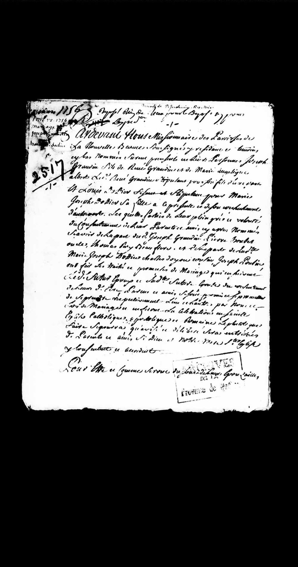 Contrat de mariage entre Joseph Grondin, fils de René Grondin et de Marie-Angélique Albert; et Marie-Josèphe Dodier, fille de Louis Dodier