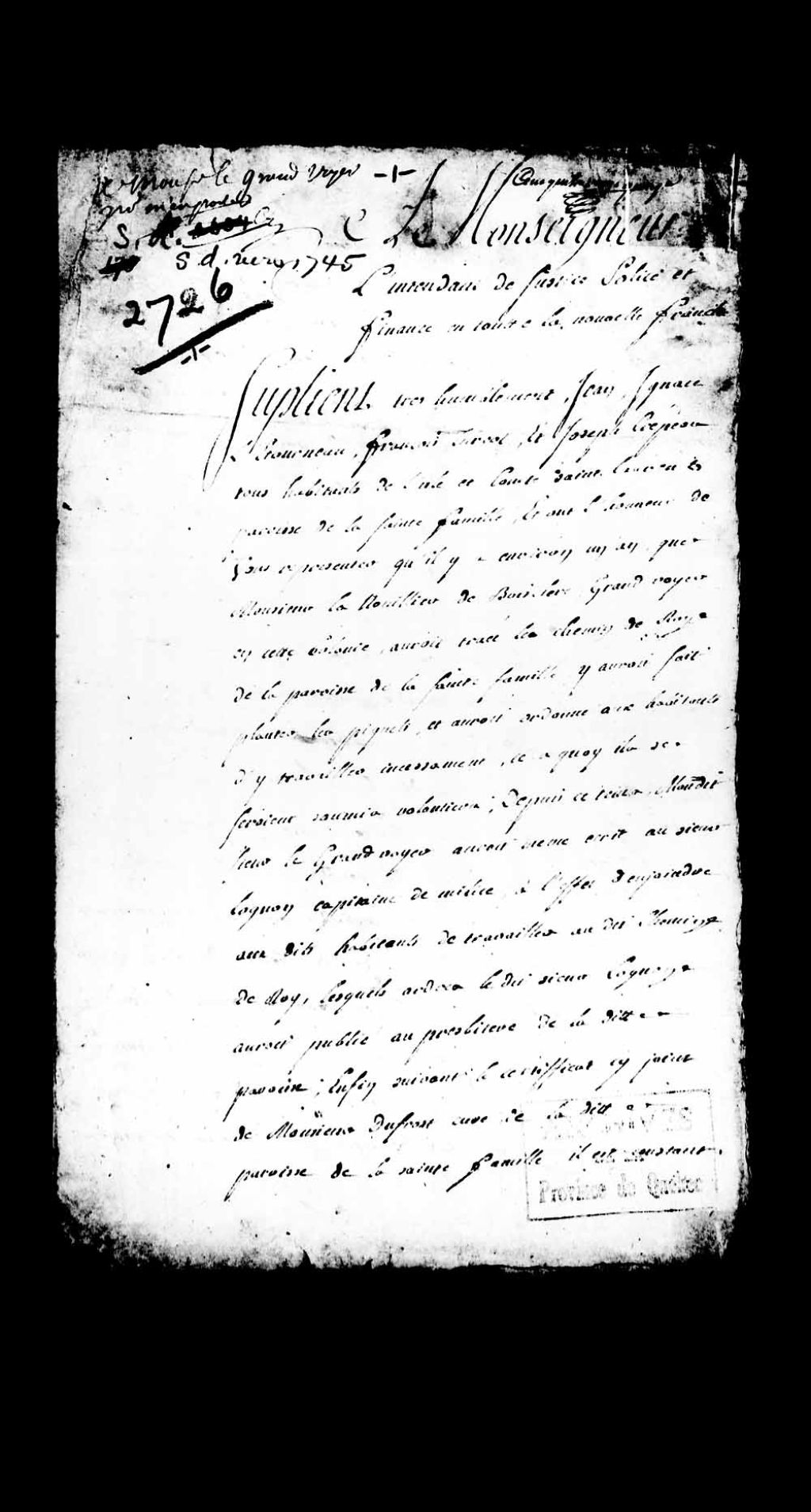 Requête de Jean et Ignace Létourneau, François Turcot et Joseph Crépeau, de la Sainte-Famille, île d'Orléans, se plaignant que quoique le chemin du Roi a été tracé l'année d'auparavant par le grand voyer, on n'a encore rien fait, 1er janvier 1729 - 31 décembre 1748, Archives nationales à Québec, Collection Pièces judiciaires et notariales, (03Q,TL5,D2726).