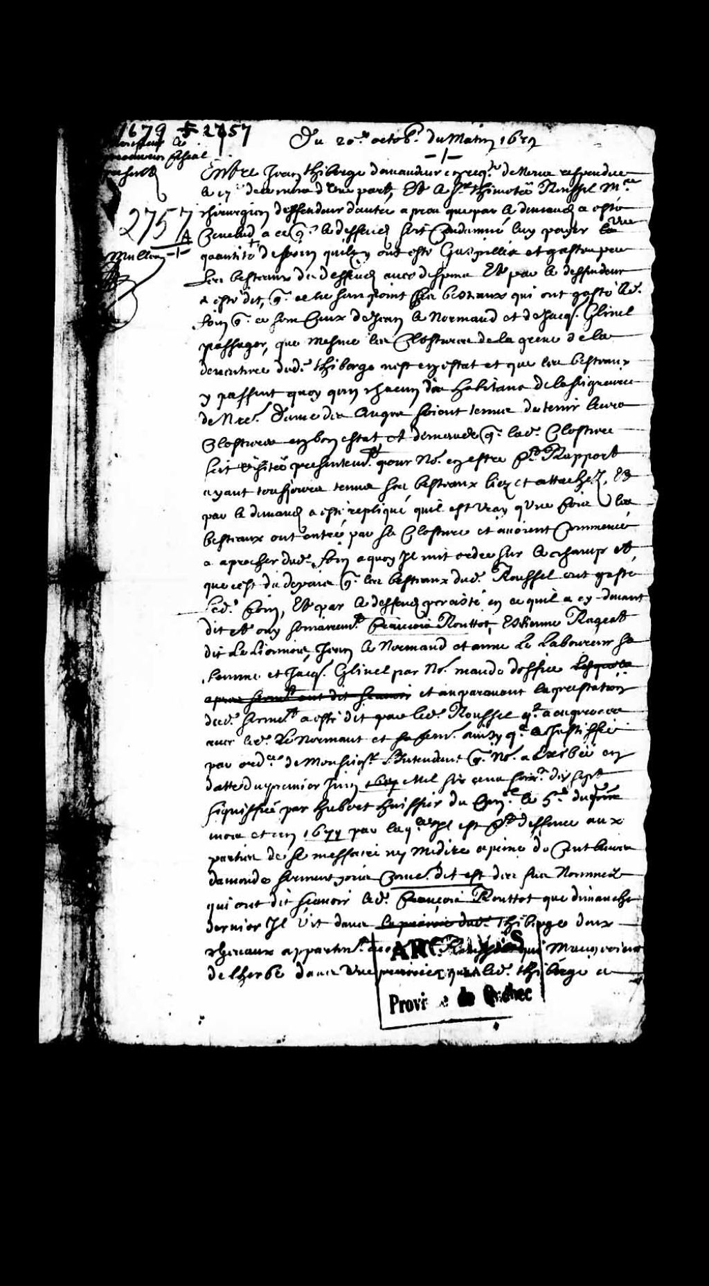 Présentation de la cause, en présence du procureur fiscal, dans le procès opposant Jean Thiberge à Timothée Roussel au sujet de dommages causés par les bestiaux (animaux) dudit Roussel, maître chirurgien, et compte rendu à la suite de l'audition des témoins, 20 octobre 1679, Archives nationales à Québec, Collection Pièces judiciaires et notariales, (03Q,TL5,D2757-1).