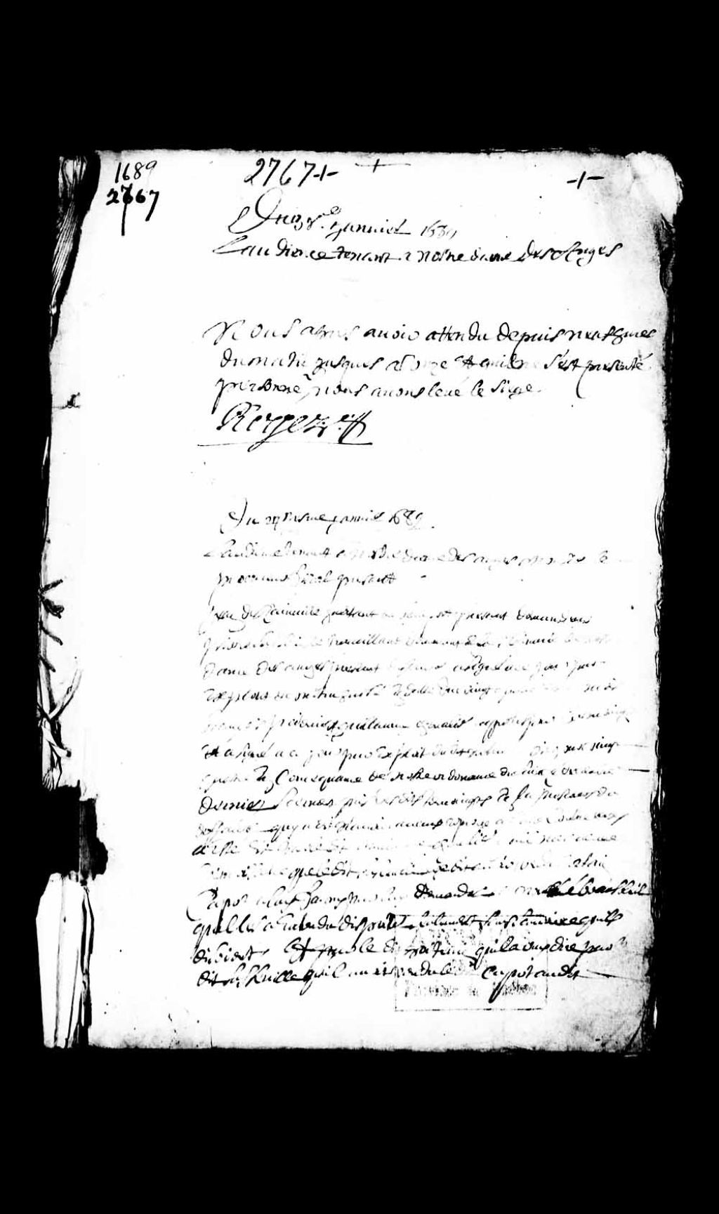 Jugement rendu par le juge prévôt Guillaume Roger en faveur de Jean Rainville, habitant de Beauport, dans le litige pour dettes l'opposant à Pierre Sasseville, demeurant en la seigneurie Notre-Dame-des-Anges, et compte rendu sommaire à la suite de l'audition des témoins, 27 janvier 1689, Archives nationales à Québec, Collection Pièces judiciaires et notariales, (03Q,TL5,D2767-2).