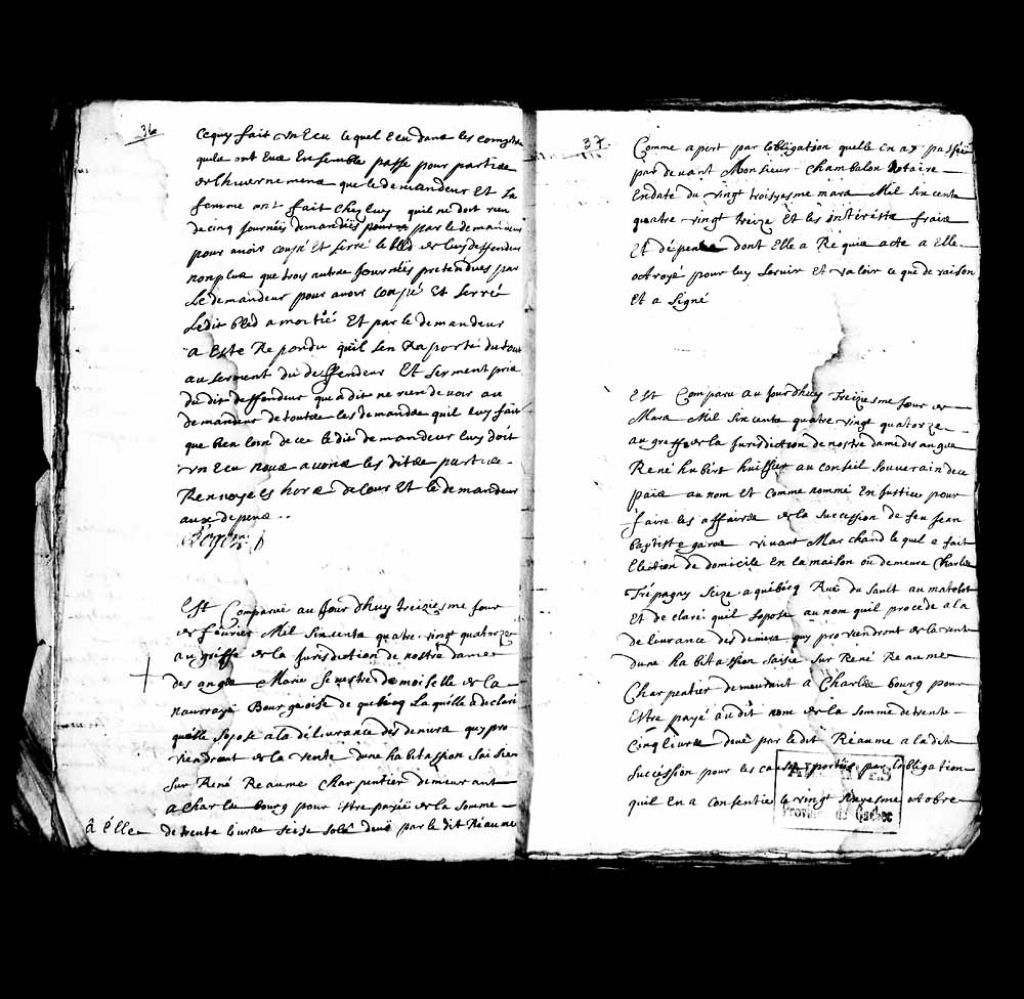 Procès-verbal à la suite de la comparution au greffe de la Juridiction de Notre-Dame-des-Anges de René Hubert, huissier au Conseil souverain, au nom et comme représentant en justice de la succession de feu Jean-Baptiste Gareau, marchand, lequel René Hubert s'oppose au nom de ladite succession à la délivrance des deniers provenant de la vente d'une habitation saisie de René Réaume…, 13 mars 1694, Archives nationales à Québec, Collection Pièces judiciaires et notariales, (03Q,TL5,D2769-33).