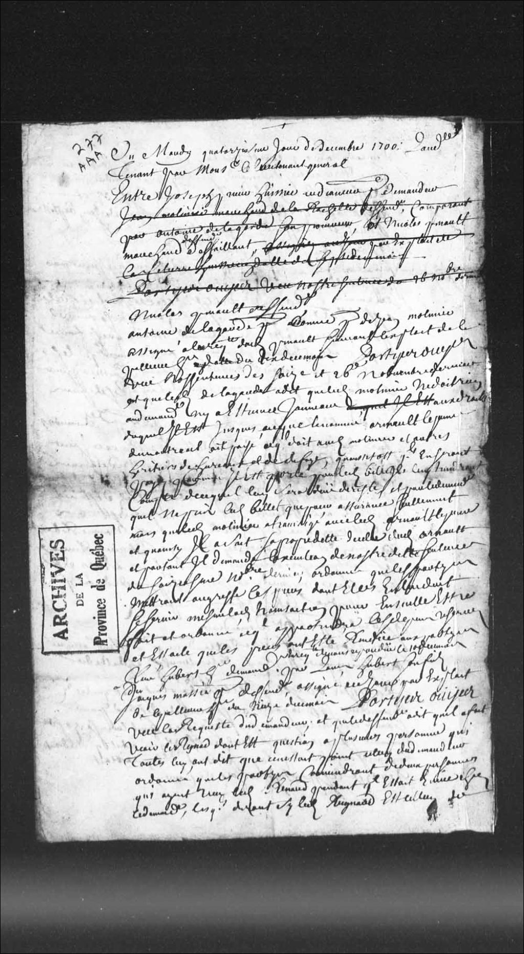Ordonnance du lieutenant général de la Prévôté de Québec, qui accorde un défaut à Adrien Bordereau (Bourdezeau) Laborde, demandeur contre Charles Amiot Villeneuve, défendeur et défaillant à une assignation à comparaître, donnée par La Cetière, le 6 décembre 1700, afin de se voir condamner à payer au défendeur la somme de 24 livres, 9 sols qu'il lui doit, suivant un billet de sa femme daté du 8 juillet 1700, 14 décembre 1700, Archives nationales à Québec, Collection Pièces judiciaires et notariales, (03Q,TL5,D277-127).