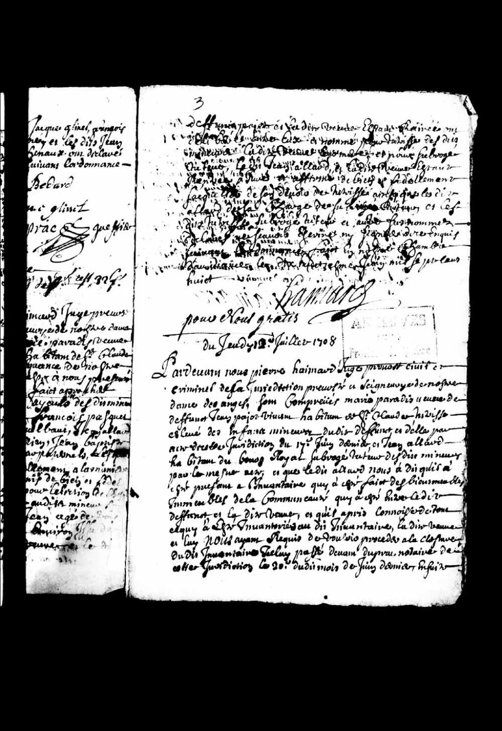 Clôture de l'inventaire des biens de la communauté entre le défunt Jean Pageau (Pageot), habitant de Saint-Claude, et Marie Paradis, 12 juillet 1708, Archives nationales à Québec, Collection Pièces judiciaires et notariales, (03Q,TL5,D2812-4).