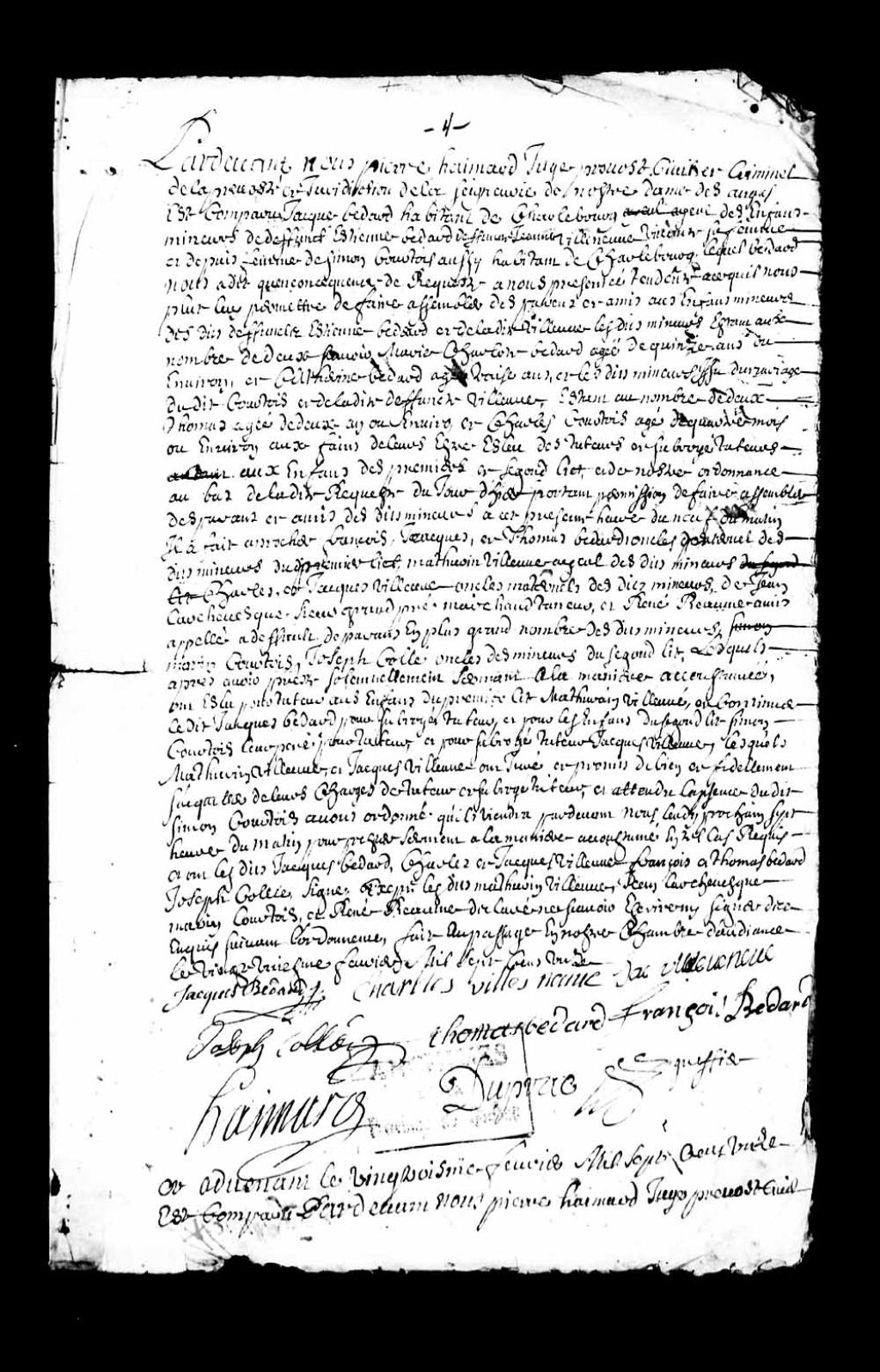 Deuxième acte de tutelle concernant les enfants mineurs des défunts Étienne Bédard et Marie-Jeanne Villeneuve, et concernant les enfants mineurs du deuxième lit de ladite défunte Marie-Jeanne Villeneuve et du défunt Simon Courtois, Mathurin Villeneuve, tuteur desdits enfants du premier lit, ayant requis d'être libéré de sa charge et Simon Courtois, père et tuteur desdits enfants du deuxième lit, étant décédé, 2 juin 1711, Archives nationales à Québec, Collection Pièces judiciaires et notariales, (03Q,TL5,D2818B-7).
