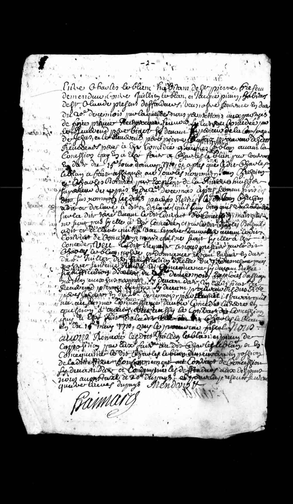Renvoi par le juge prévôt Pierre Émard (Haimard) de l'opposition faite par Julien Leblanc et Jacques Pivin, habitants de Saint-Claude, à l'encontre de Charles Leblanc, habitant de Saint-Pierre, compte rendu à la suite de l'audition des témoins Jean Chrétien et Charles Boesmé (Boismé) et jugement rendu en faveur dudit Charles Leblanc, lequel conservera la terre à l'origine du litige conformément à son contrat de concession fait en date du 15 mai 1710, 27 août 1716, Archives nationales à Québec, Collection Pièces judiciaires et notariales, (03Q,TL5,D2842-2).