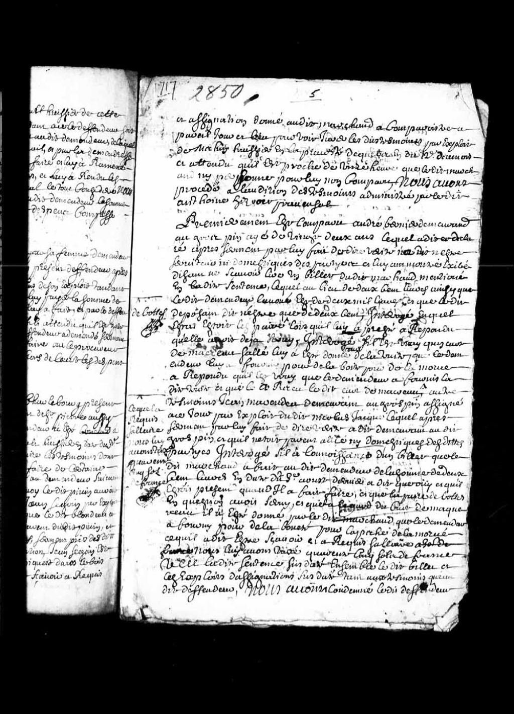 Défaut accordé par le procureur fiscal Étienne Dubreuil à Antoine Isoir dit Provençal, jugement rendu dans la cause pour dettes l'opposant à Pierre Marchand (défaillant), lequel est condamné à verser audit Isoir la somme de 200 livres, sauf à déduire la somme de 40 livres portée par la sentence rendue en date du 11 mars 1717, et à verser la somme de 24 livres du pays pour les dépens du procès, et compte rendu à la suite de l'audition des témoins André Bernier (22 ans), demeurant au Gros-Pin, et Jean Maranda, demeurant aussi audit lieu, 12 juin 1717 - 7 juillet 1717, Archives nationales à Québec, Collection Pièces judiciaires et notariales, (03Q,TL5,D2850-8).