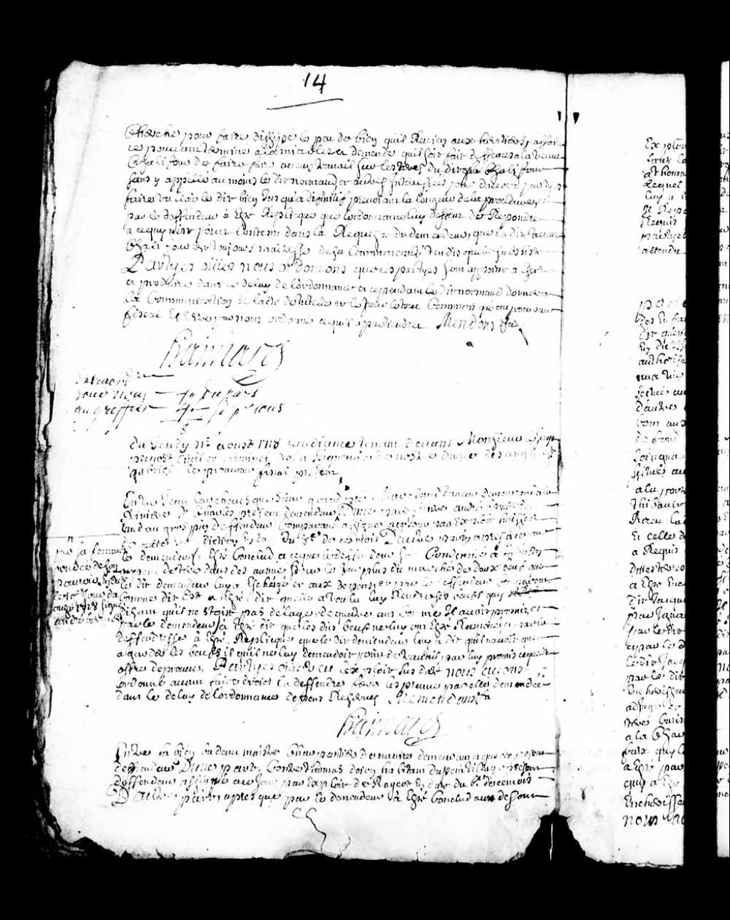 Renvoi hors cour des parties par le juge prévôt Pierre Émard (Haimard) dans la cause concernant une terre opposant Fabien Badeau, maître charpentier de navires demeurant à Québec, à Thomas Doyon, habitant du Petit Village, attendu qu'il n'y a pas de preuves suffisantes, et compte rendu à la suite de l'audition du témoin Thomas Touchet, 11 août 1718, Archives nationales à Québec, Collection Pièces judiciaires et notariales, (03Q,TL5,D2853-21).