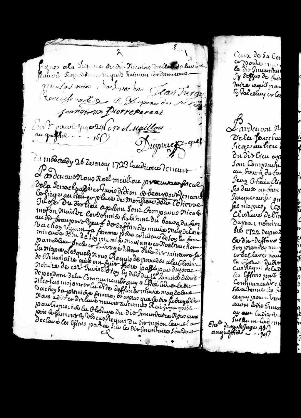 Clôture de l'inventaire des biens de la communauté entre Nicolas Mongeon, maître cordonnier, habitant du bourg du Fargy en la seigneurie de Beauport, et la défunte Marie-Madeleine Vachon, 26 mai 1723, Archives nationales à Québec, Collection Pièces judiciaires et notariales, (03Q,TL5,D2868-2).