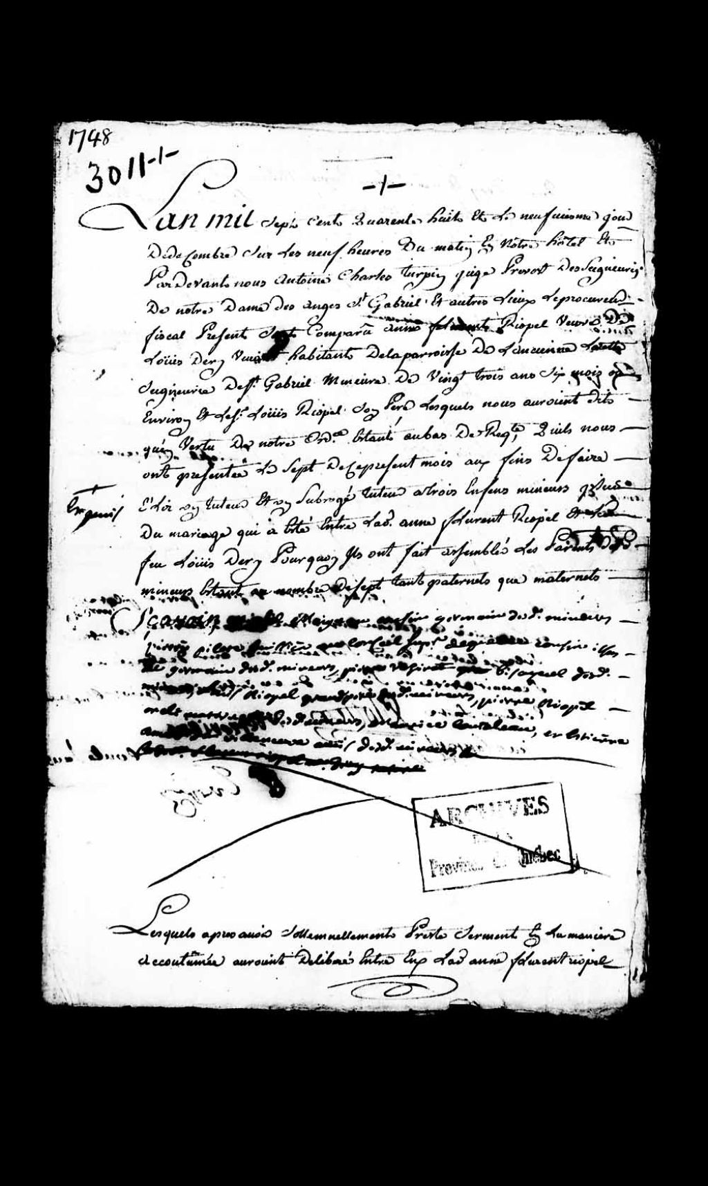 Acte de tutelle concernant les enfants mineurs d'Anne Riopel, 23 ans, et du défunt Louis Déry, ladite Riopel étant nommée tutrice avec son père Louis Riopel comme cotuteur jusqu'à la majorité de ladite Riopel et Étienne Amiot dit Villeneuve, ami desdits enfants mineurs, étant nommé subrogé tuteur, 9 décembre 1748, Archives nationales à Québec, Collection Pièces judiciaires et notariales, (03Q,TL5,D3011).