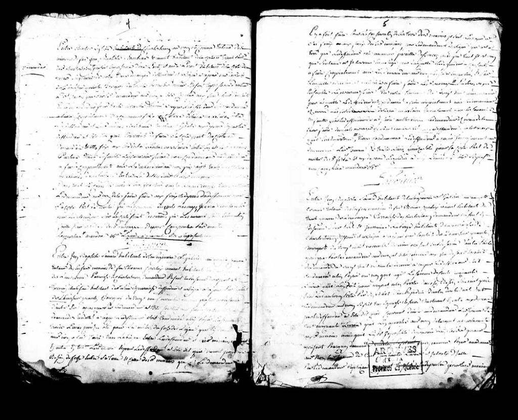 Jugement rendu par le juge prévôt Paul-Antoine-François Lanouillier (Lanoullier), sieur Desgrandes (Desgranges), en faveur de Charles Lefebvre, habitant de Charlesbourg, au nom et comme tuteur des enfants mineurs du défunt Jean-Baptiste Bourbeau, habitant de la côte Saint-Joseph de la paroisse de Charlesbourg, dans la cause l'opposant à André Parent, habitant de la côte des Pères en la seigneurie Notre-Dame-des-Anges, concernant le partage des frais des clôtures de ligne nécessaires entre les terres des deux parties, lequel Parent est condamné à faire conjointement avec le demandeur lesdites clôtures nécessaires au cours du mois de mai, après quoi le demandeur pourra faire faire lesdites clôtures par des ouvriers aux frais dudit Parent, 5 décembre 1754, Archives nationales à Québec, Collection Pièces judiciaires et notariales, (03Q,TL5,D3104-7).