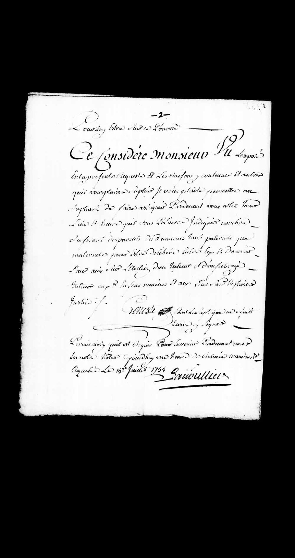Permission accordée par le juge prévôt Paul-Antoine-François Lanouillier (Lanoullier), sieur Desgrandes (Desgranges), de faire assembler les parents et amis des enfants mineurs de Pierre Jobin et de la défunte Marie-Anne Cliche, 15 juillet 1755, Archives nationales à Québec, Collection Pièces judiciaires et notariales, (03Q,TL5,D3126-2).