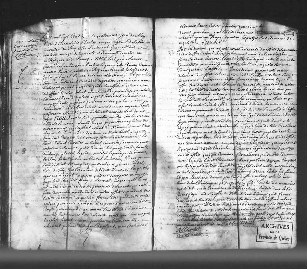 Convention judiciaire devant le lieutenant général civil et criminel de la Prévôté et Amirauté de Québec, entre les créanciers de la succession de Nicolas Volant, soit les sieurs Delino, conseiller au Conseil souverain de Québec, Monseignat, contrôleur de la Marine, Petit, trésorier de la Marine, Delepinay (L'Espinay), Trehet, Pinault, Dombourg, Plassant (Plassan), Lagarde, Rousselot, Laprerie (Laprairie), Hubert, huissier au Conseil souverain, faisant pour Louis Niort La Noraye et pour Nicolas et Pierre Trudel, Testu (Têtu) de Tilly, en présence de Jacques Guyon Dufresnaye (du Fresné), tuteur des enfants mineurs dudit défunt Volant
