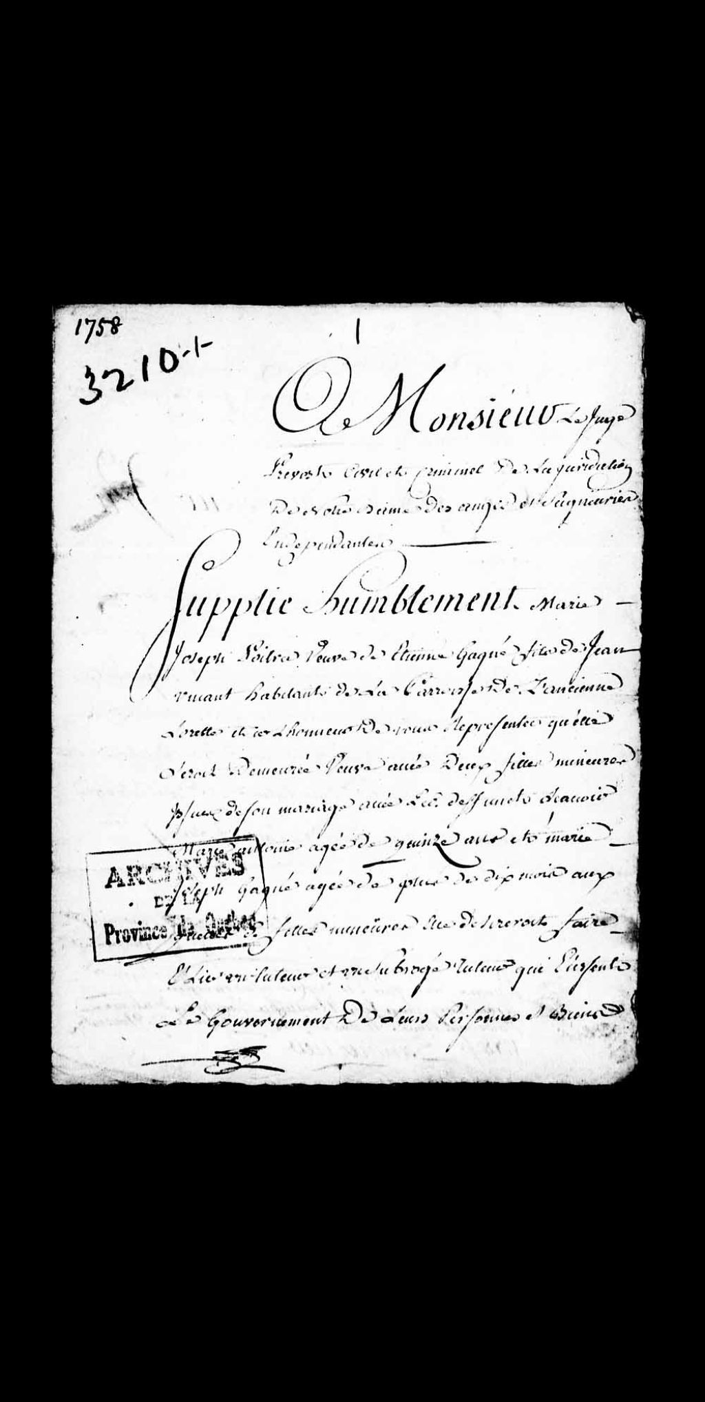 Requête de Marie-Josèphe Poitras, veuve de Étienne Gagné, fils de Jean Gagné et habitant de la paroisse de L'Ancienne-Lorette, demandant la permission de faire comparaître les parents et amis de Marie-Antoine Gagné, 15 ans; et de Marie-Josèphe Gagné, 10 mois, enfants mineures issues de son mariage avec le défunt Gagné, dans le but de faire élire un tuteur pour lesdites enfants mineures, 27 novembre 1758, Archives nationales à Québec, Collection Pièces judiciaires et notariales, (03Q,TL5,D3210-1).