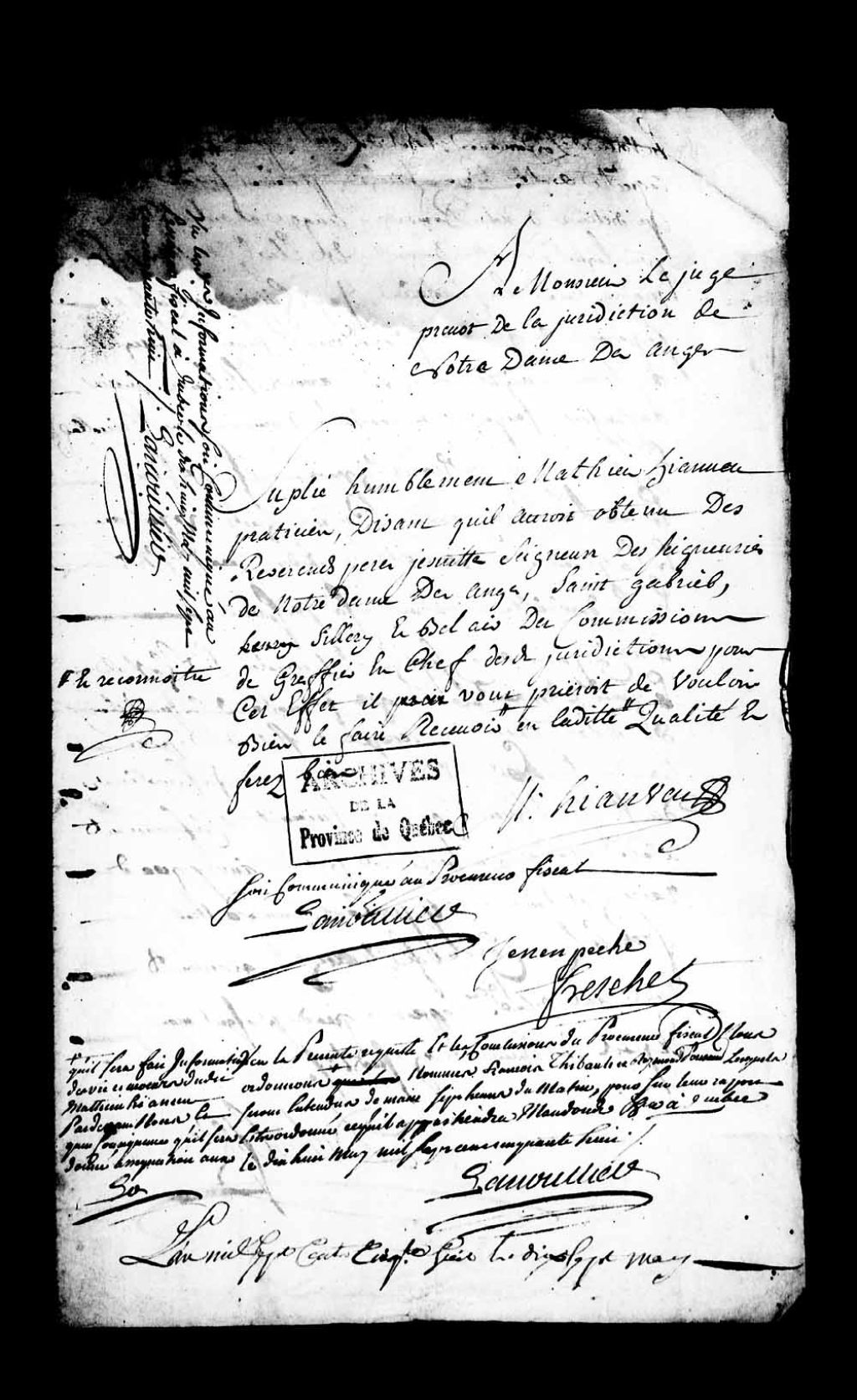 Déclaration de Robert Duhault, huissier au Conseil supérieur de Québec, résidant sur la rue Saint-François, à l'effet qu'il a remis des assignations à comparaître au sieur François Thibault, aussi huissier audit Conseil supérieur, demeurant sur la rue Saint-Nicolas, et au sieur Raymond Ponsant, huissier royal en la Prévôté de Québec, résidant sur la rue Saint-Charles, pour l'enquête sur l'information de vie et moeurs du sieur Mathieu Hianveu, 18 mai 1758, Archives nationales à Québec, Collection Pièces judiciaires et notariales, (03Q,TL5,D3211-6).