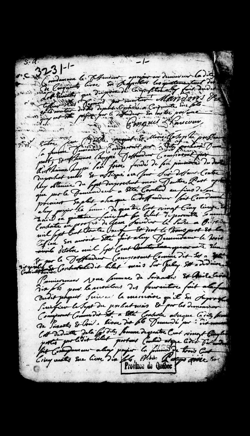 Jugement rendu par le juge prévôt Jacques Pinguet, sieur de Vaucours (Vaucourt, Vaucour), en faveur de Jean-Baptiste Paquet et sa femme Marie-Josèphe Presseau qui comparaît pour lui, dans la cause les opposant à Thomas Huppé dit Lagroix, concernant une dette en vertu d'un billet, lequel Huppé est condamné à payer aux demandeurs la somme de 351 livres dix sols dans un délais de quatre mois à la suite de la requête du défendeur, c'est-à-dire 100 livres dans les huit jours suivant ledit jugement, 100 livres au mois de décembre, 100 livres au mois de janvier et les 51 livres dix sols restant au mois de février, 1er octobre 1741 - 31 décembre 1741, Archives nationales à Québec, Collection Pièces judiciaires et notariales, (03Q,TL5,D3231-2).