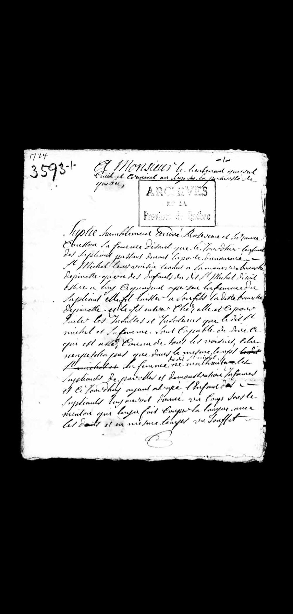 Requête de André Rodereau et Suzanne Cousson, sa femme, contre leur voisin nommé Saint-Michel et sa femme, réclamant réparation pour paroles, injures, coups et démonstrations infâmes, 16 février 1724, Archives nationales à Québec, Collection Pièces judiciaires et notariales, (03Q,TL5,D3593).