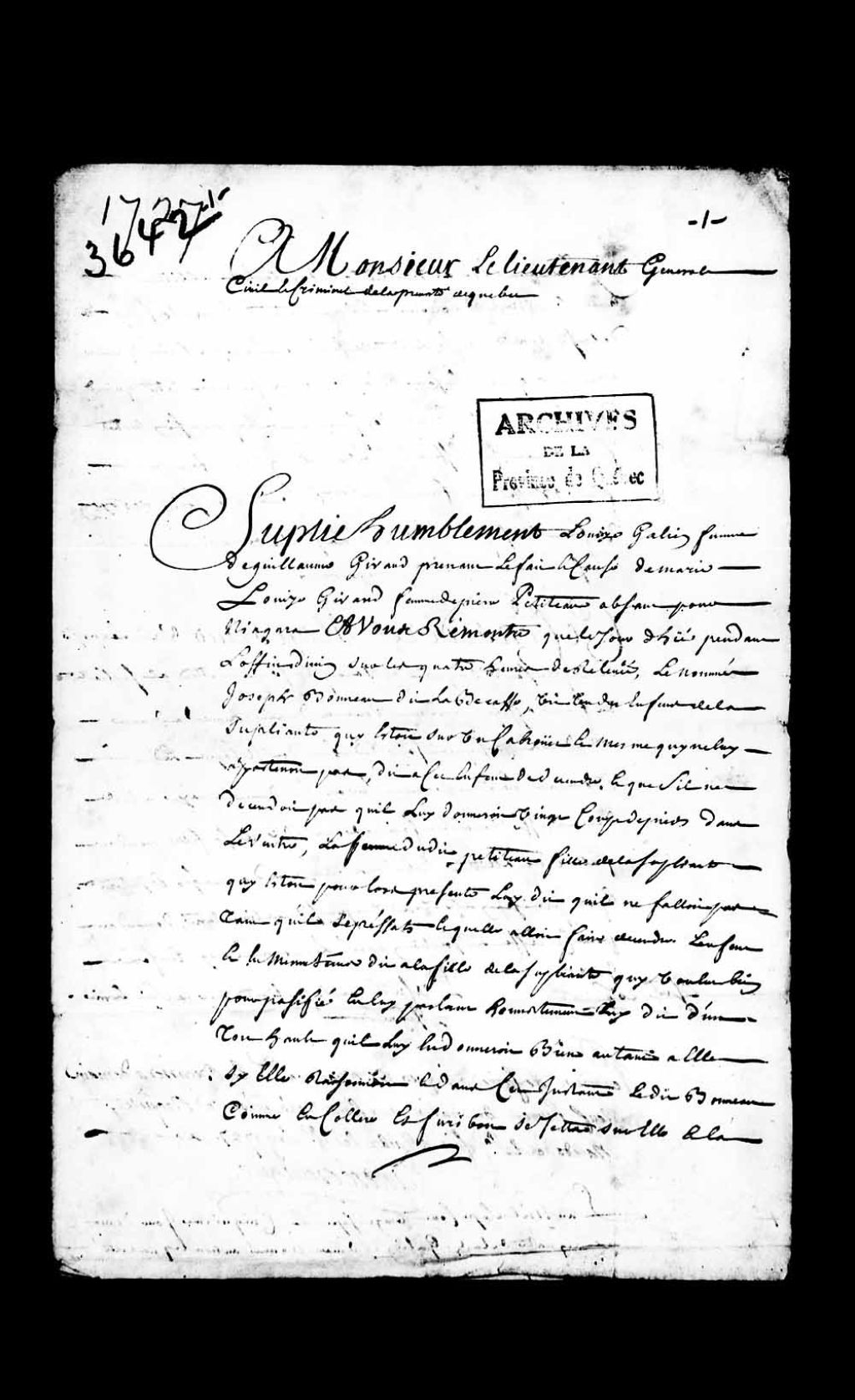 - Dossier en matières criminelles reçu par la Prévôté de Québec. Ce dossier comprend la requête de Louise Galien, ainsi que deux assignations à comparaître