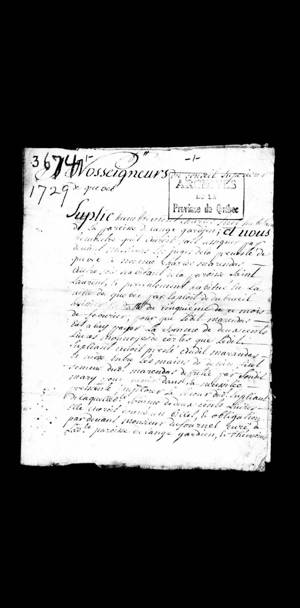 Requête de Charles Fiset, habitant de la paroisse de l'Ange-Gardien, appelant de la sentence rendue en la Prévôté de Québec, dans sa cause contre Charles Maranda, autrefois habitant de la paroisse Saint-Laurent, au sujet d'un billet promissoire fait par Denise Fiset, sa femme, pour la somme de 200 livres; demandant la permission de faire assigner les susdits et autres témoins, 22 février 1729, Archives nationales à Québec, Collection Pièces judiciaires et notariales, (03Q,TL5,D3674).